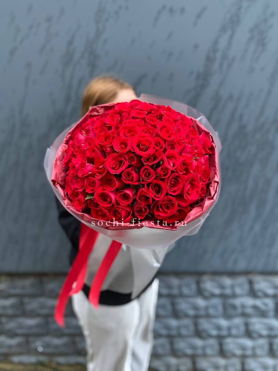 Сто один бутон образует плотную красную сферу с безупречной геометрией. Кенийская роза отличается густотой лепестков и насыщенным оттенком который не теряет глубину даже при ярком свете. Букет держит форму и впечатляет масштабом.