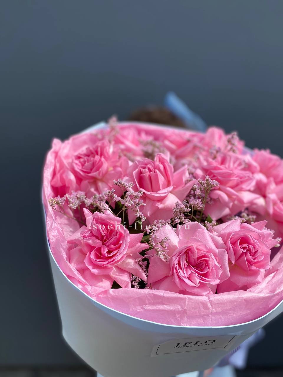 Французские розы распускаются мягкими облаками пудрового оттенка. Лимониум добавляет воздушности, а эвкалипт создает свежую основу. Букет собран так, что каждый бутон виден и дышит.