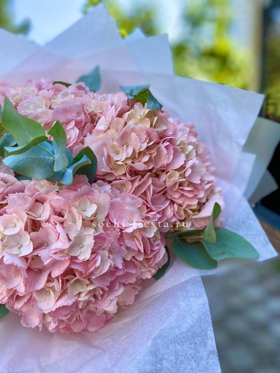 гортензия - 5 шт., эвкалипт,  лента, дизайнерская упаковка.