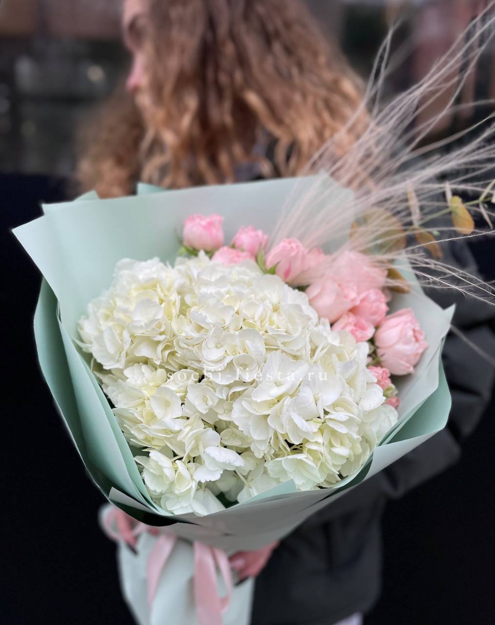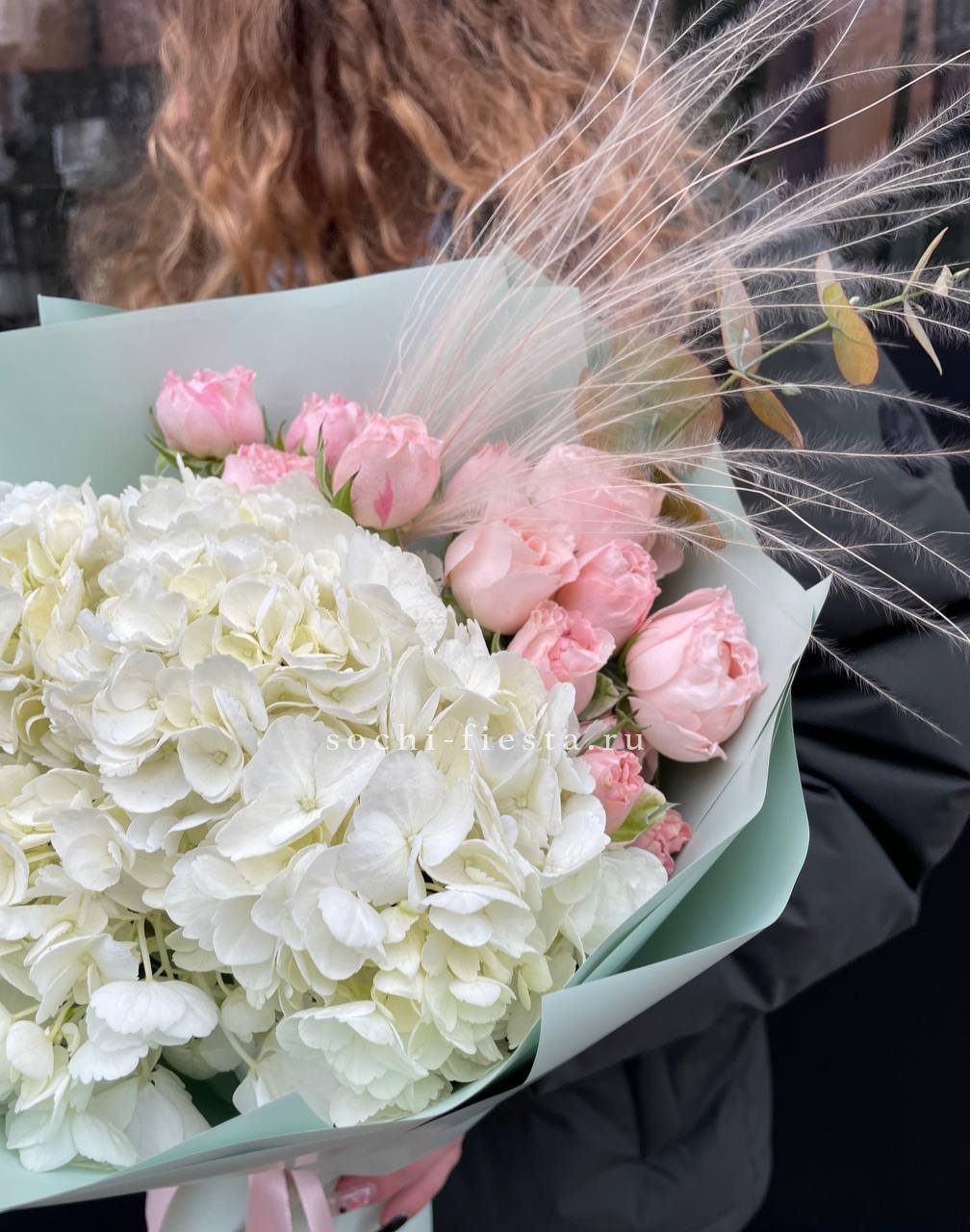 гортензия нежно-розовых оттенков, эустома, львиный зев или маттиола, розовые розы, эвкалипт, вспомогательная зелень, лента, светлая корзин.