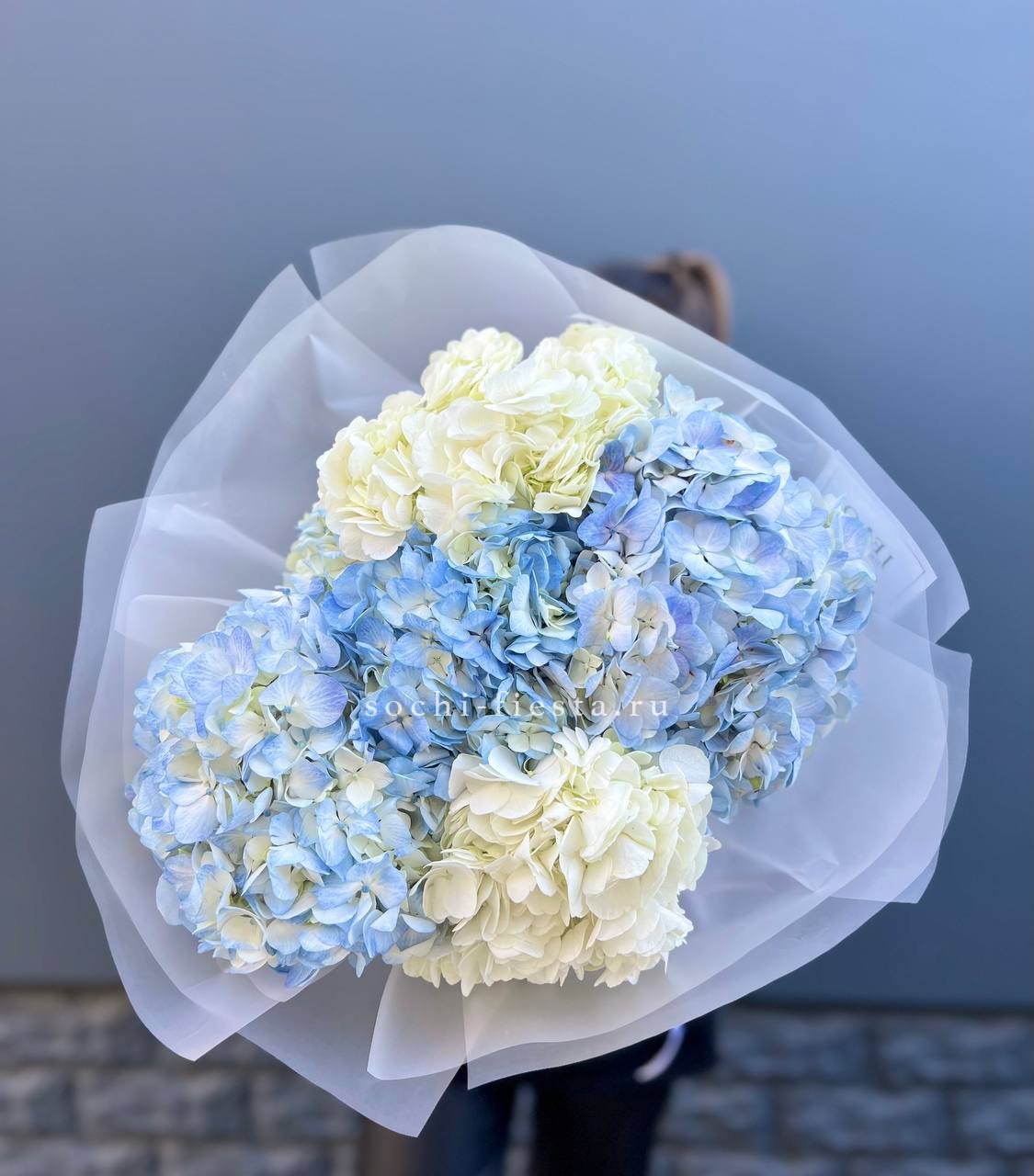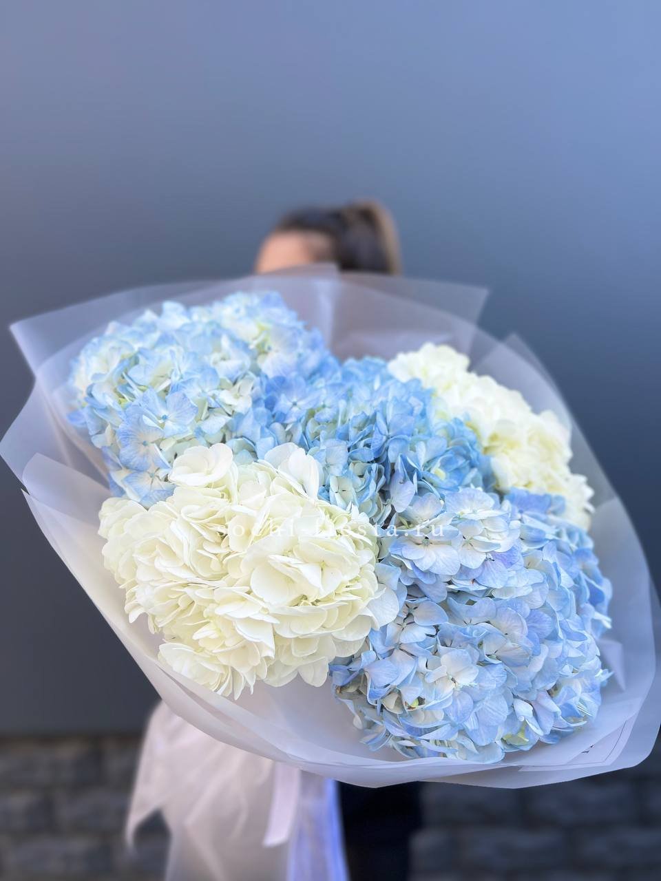 Сочетание пышной голубой гортензии и классических белых роз — это гимн нежности и чистоты. Букет, который не просто удивляет своим масштабом, но и дарит ощущение безмятежности. Идеальный выбор для самого искреннего признания.