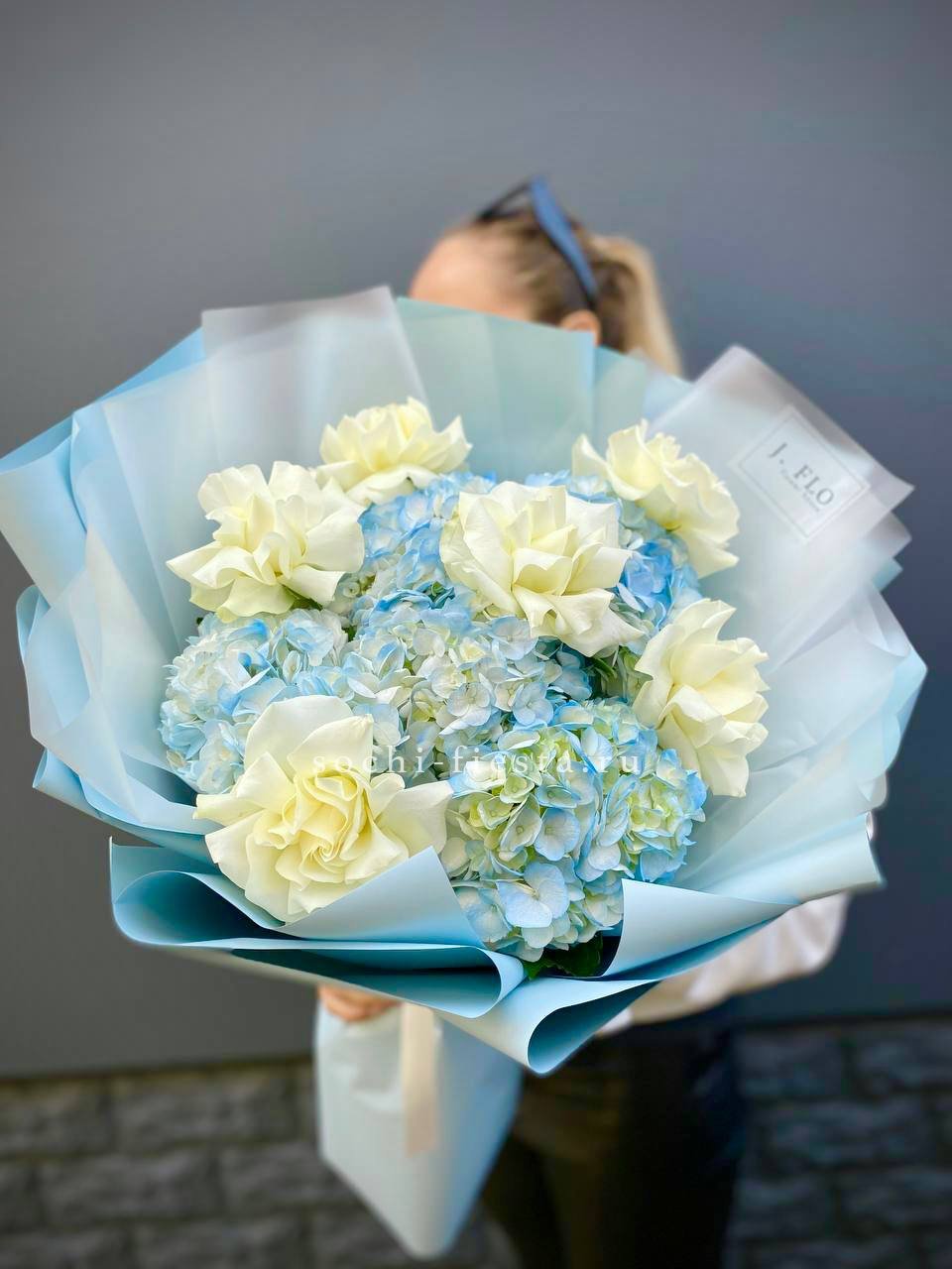 Воздушные шапки гортензий создают объёмную основу, а белые розы добавляют графичности. Голубой оттенок освежает композицию и делает её запоминающейся.
