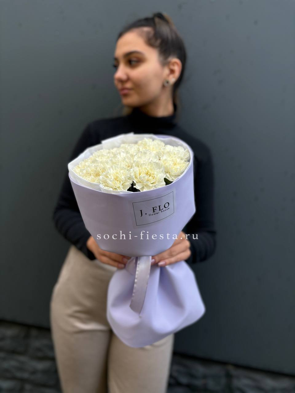 Букет из пятнадцати белых диантусов вписывается в любое пространство благодаря компактной форме. Цветы долго сохраняют свежесть и не требуют сложного ухода.