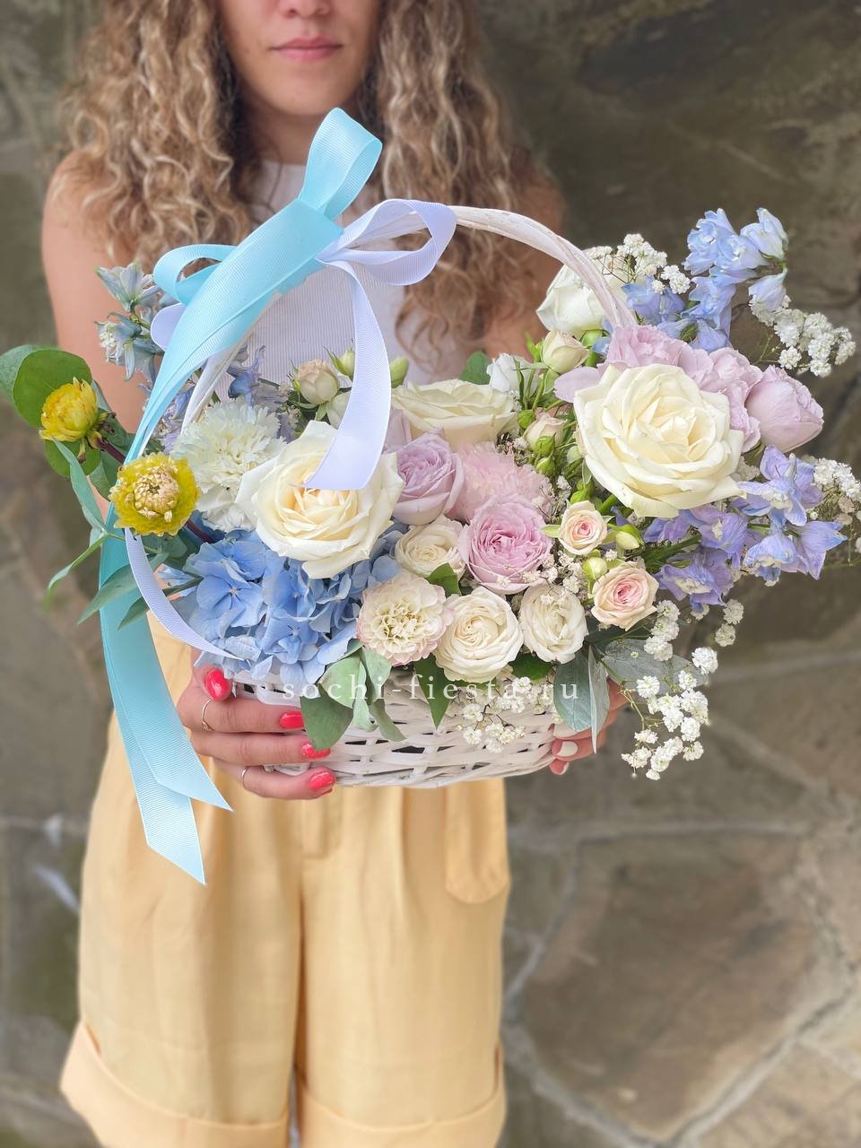 Пышная гортензия задает объем, а французские розы и эустома создают многослойную глубину. Диантусы добавляют графичные точки, эвкалипт обрамляет композицию мягкими линиями.