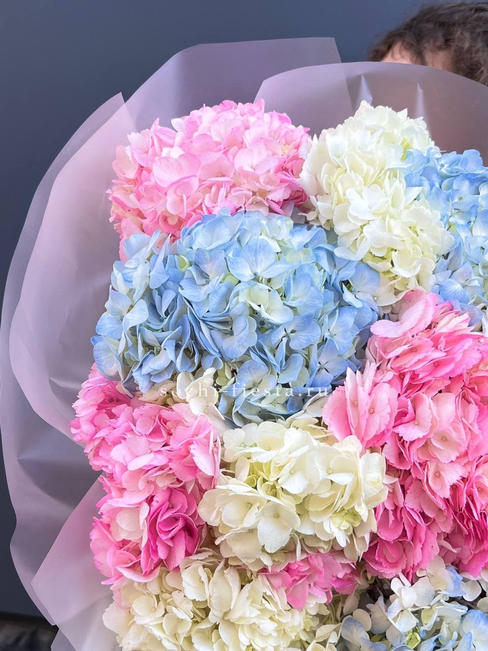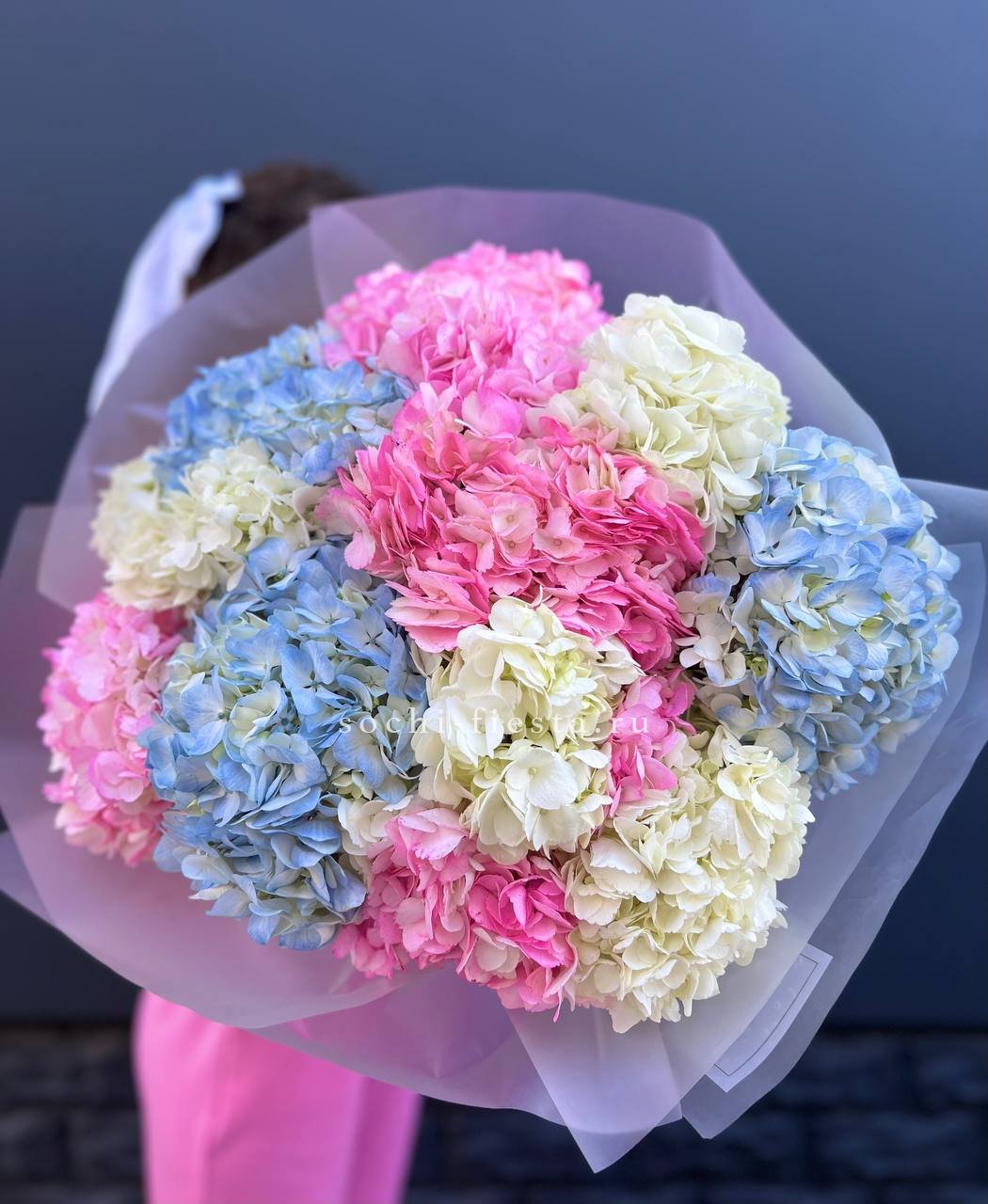Двадцать пять соцветий гортензий разных оттенков формируют пышное облако с естественной игрой цвета. Каждая головка раскрывается по-своему, создавая живую фактуру без четких границ между тонами.