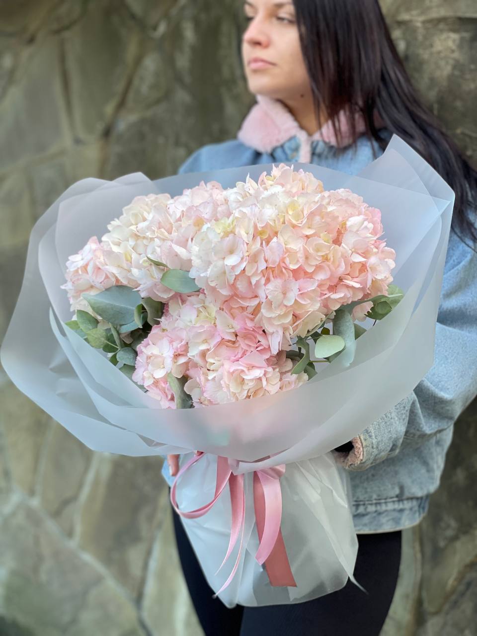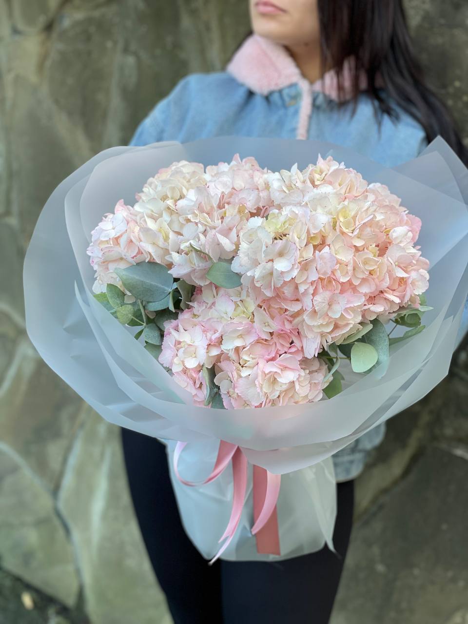 Пять соцветий гортензии в оригинальной упаковке-пиджачке. Необычная форма подачи превращает классический монобукет в яркий акцент для торжественного момента.