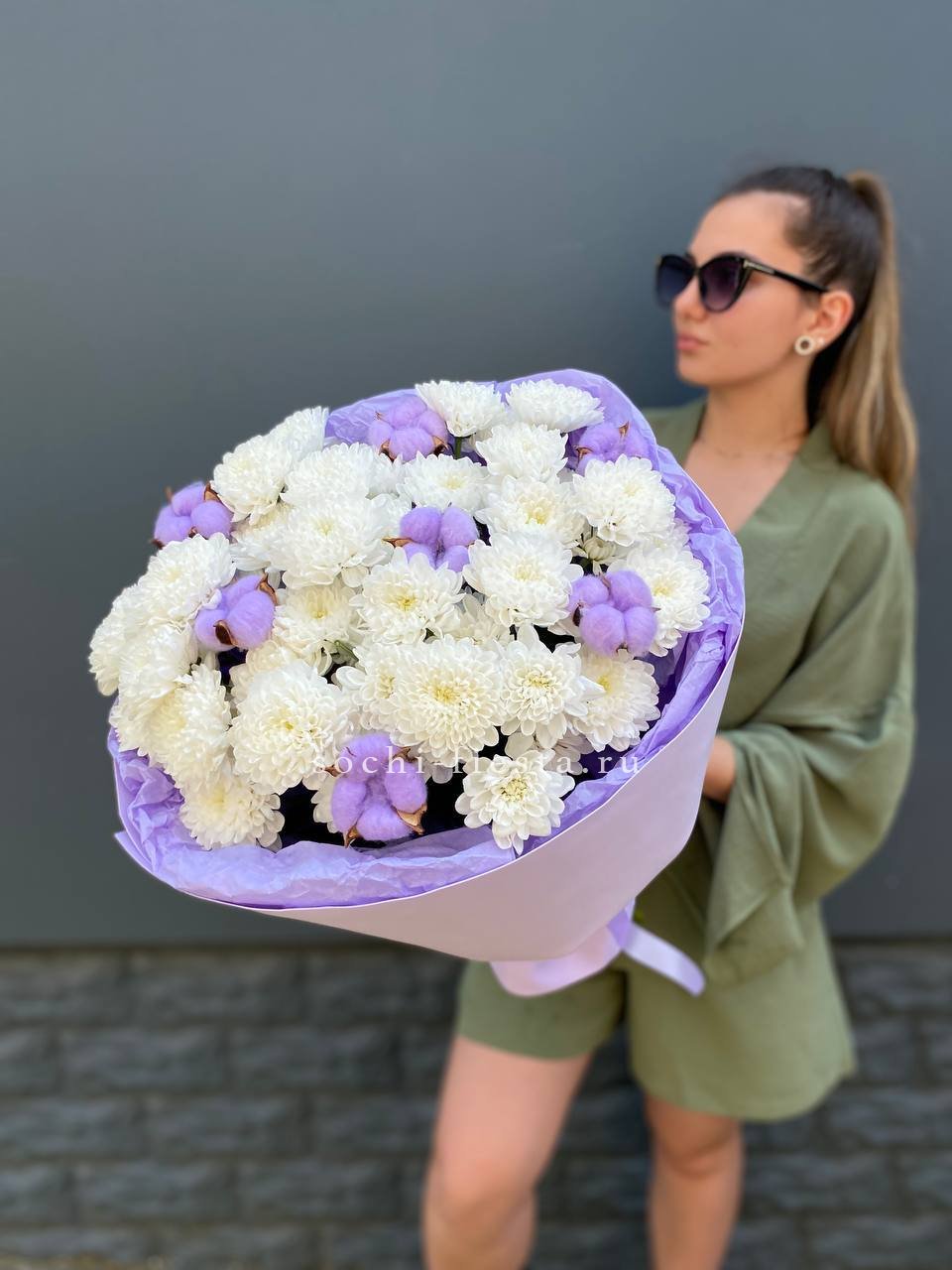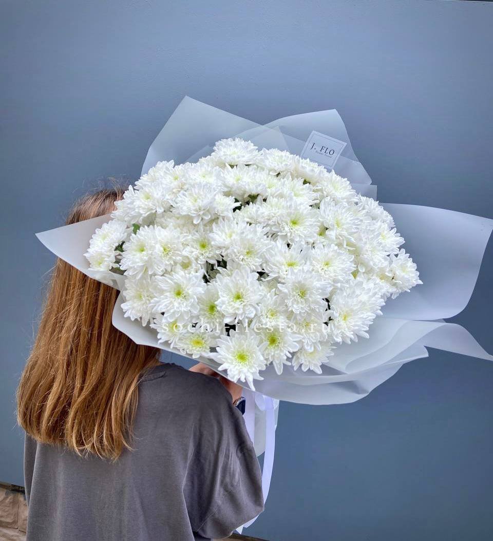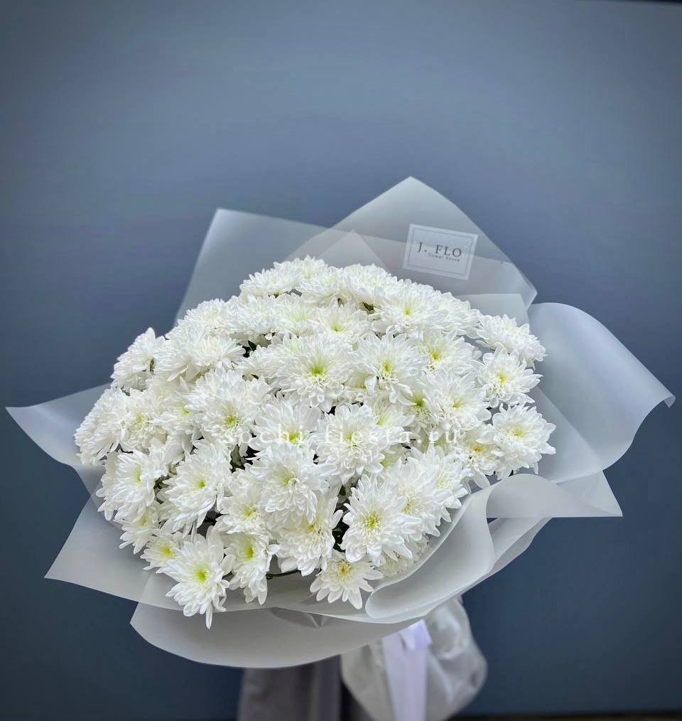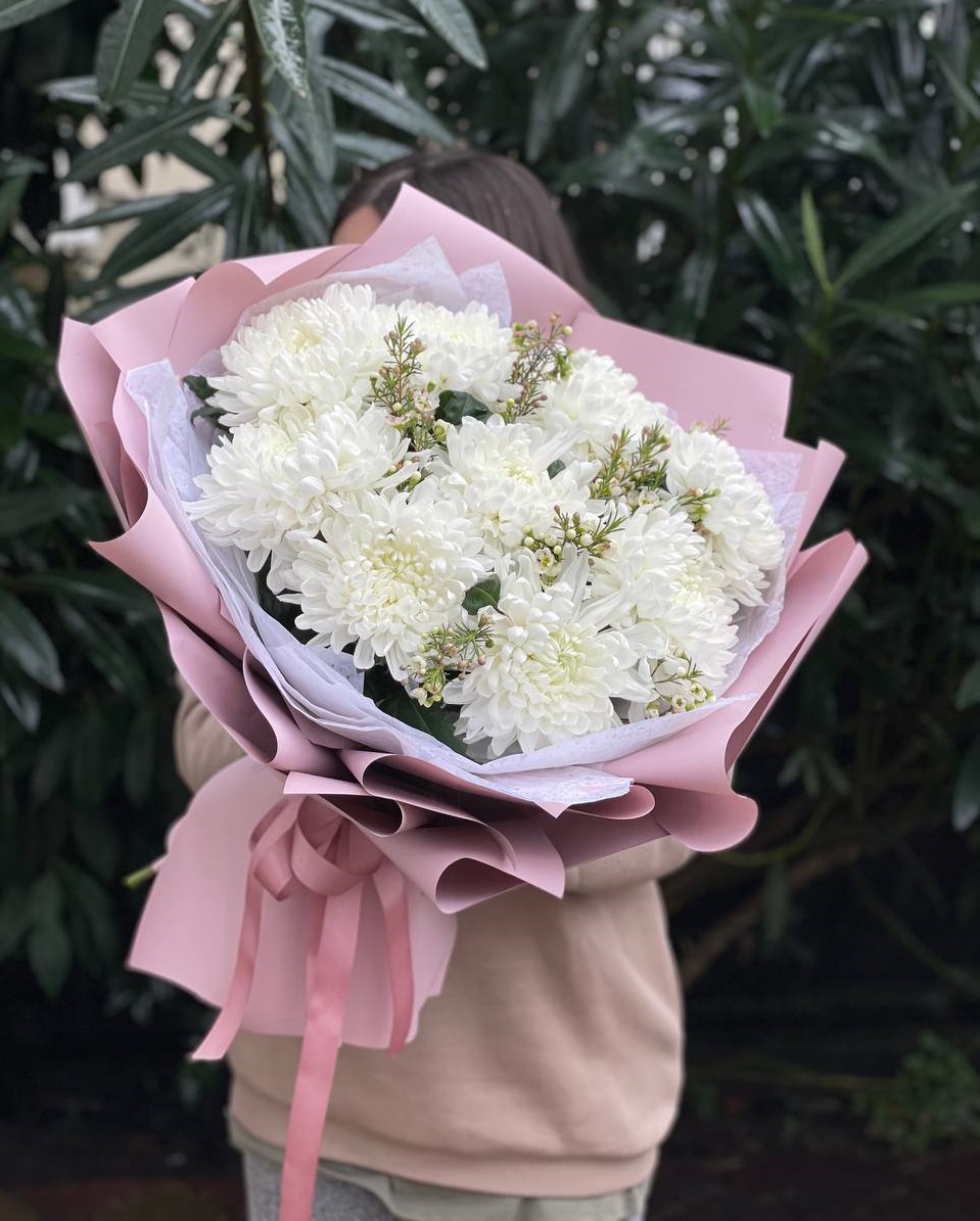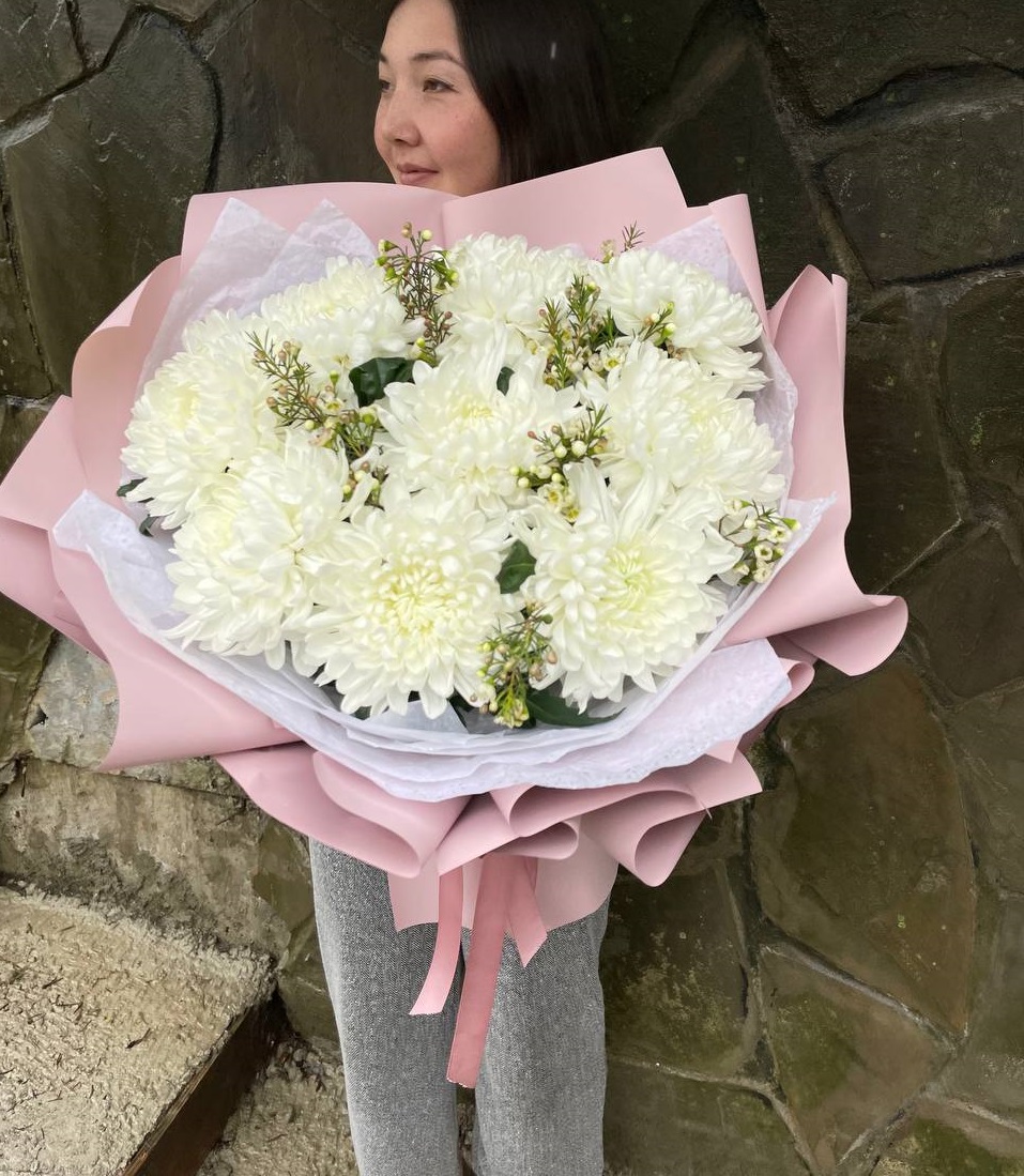Пушистые коробочки хлопка добавляют воздушности между соцветиями хризантем. Природная фактура встречается с декоративной упаковкой в компактной форме. Букет держит объём и выглядит свежо несколько дней.