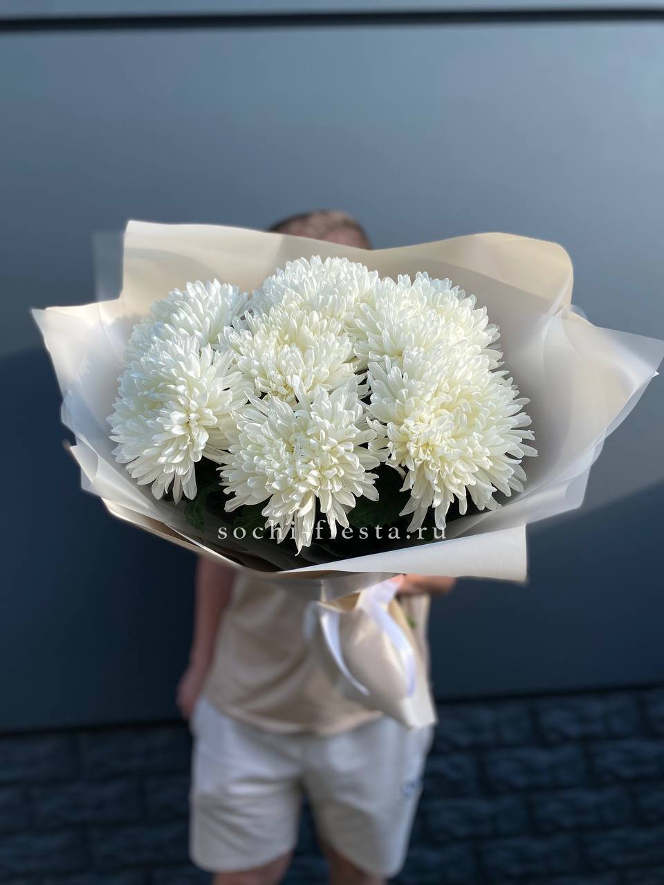 Семь крупных соцветий хризантем с пышными лепестками образуют округлую форму. Бутоны раскрыты полностью, демонстрируя многослойную структуру и живую фактуру каждого цветка.