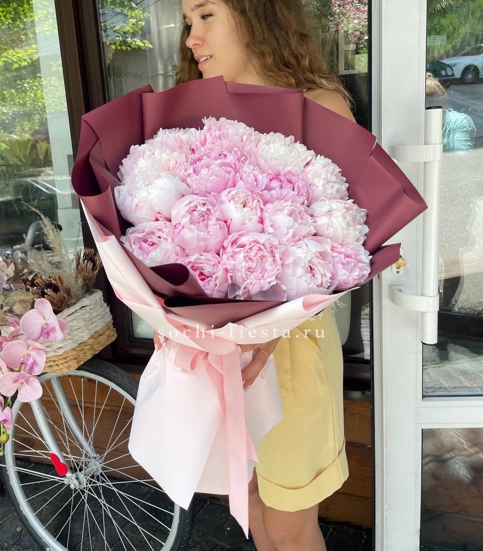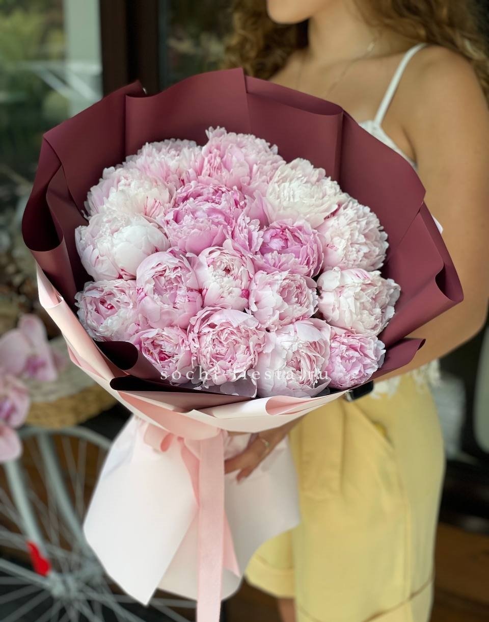 Семнадцать пионов пастельных оттенков собраны в пышную композицию. Бутоны разной степени раскрытия создают объёмную фактуру и воздушный силуэт.