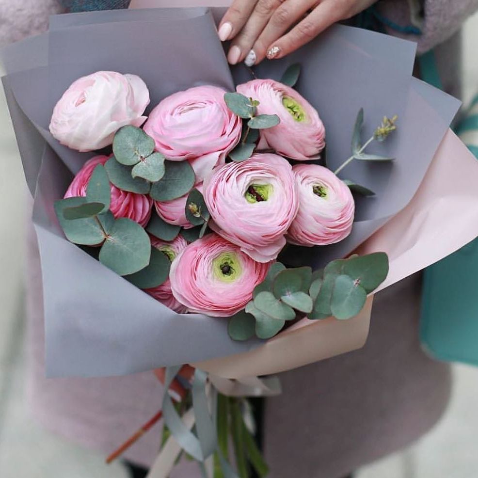 Девять бутонов ранункулюсов собраны в аккуратную композицию с серебристым эвкалиптом. Дизайнерская упаковка подчёркивает воздушность форм и свежесть зелени.