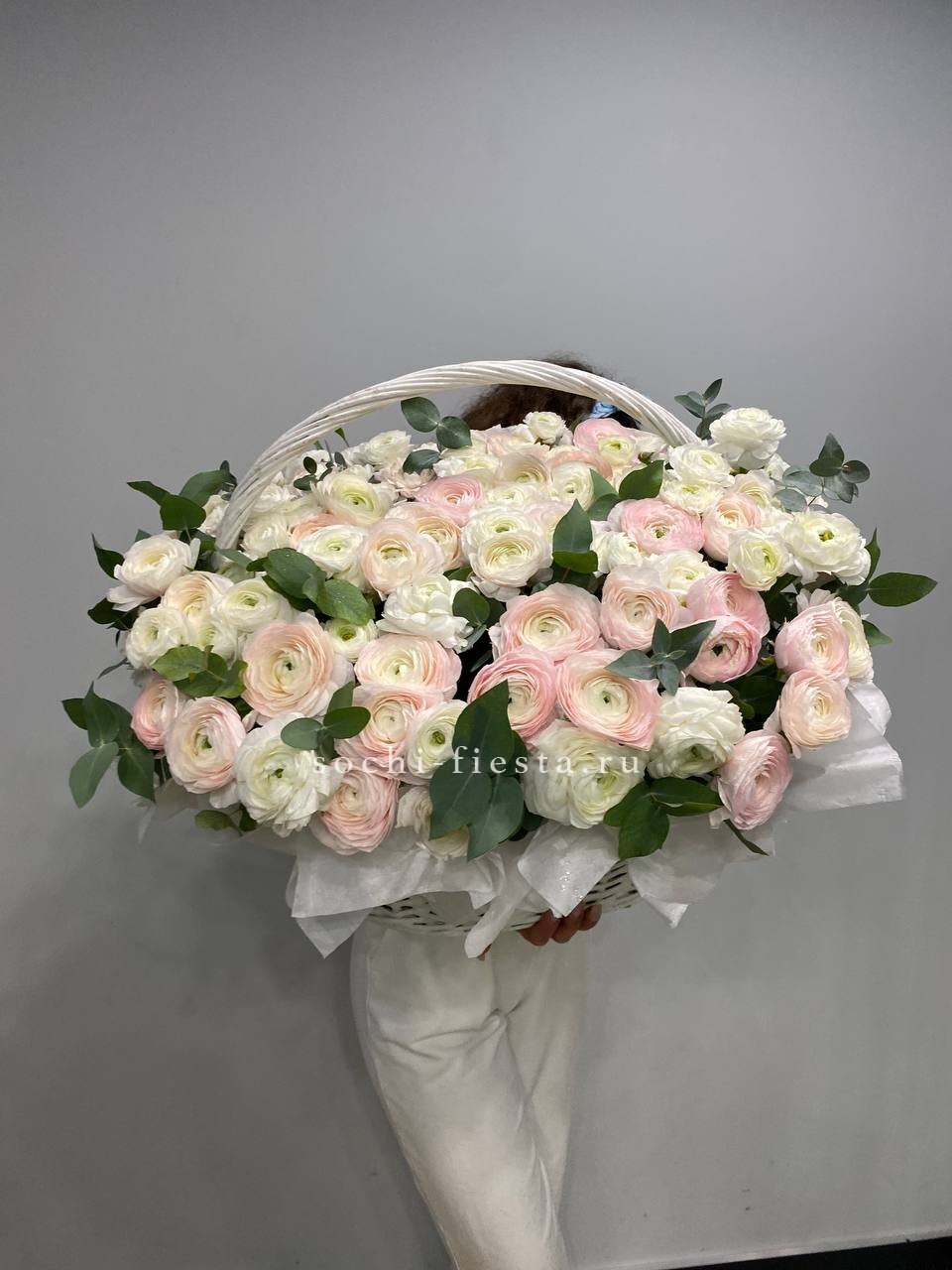 Девять ранункулюсов с серебристым эвкалиптом образуют гармоничную композицию спокойных оттенков. Матовая зелень оттеняет махровые бутоны и придает букету свежесть.