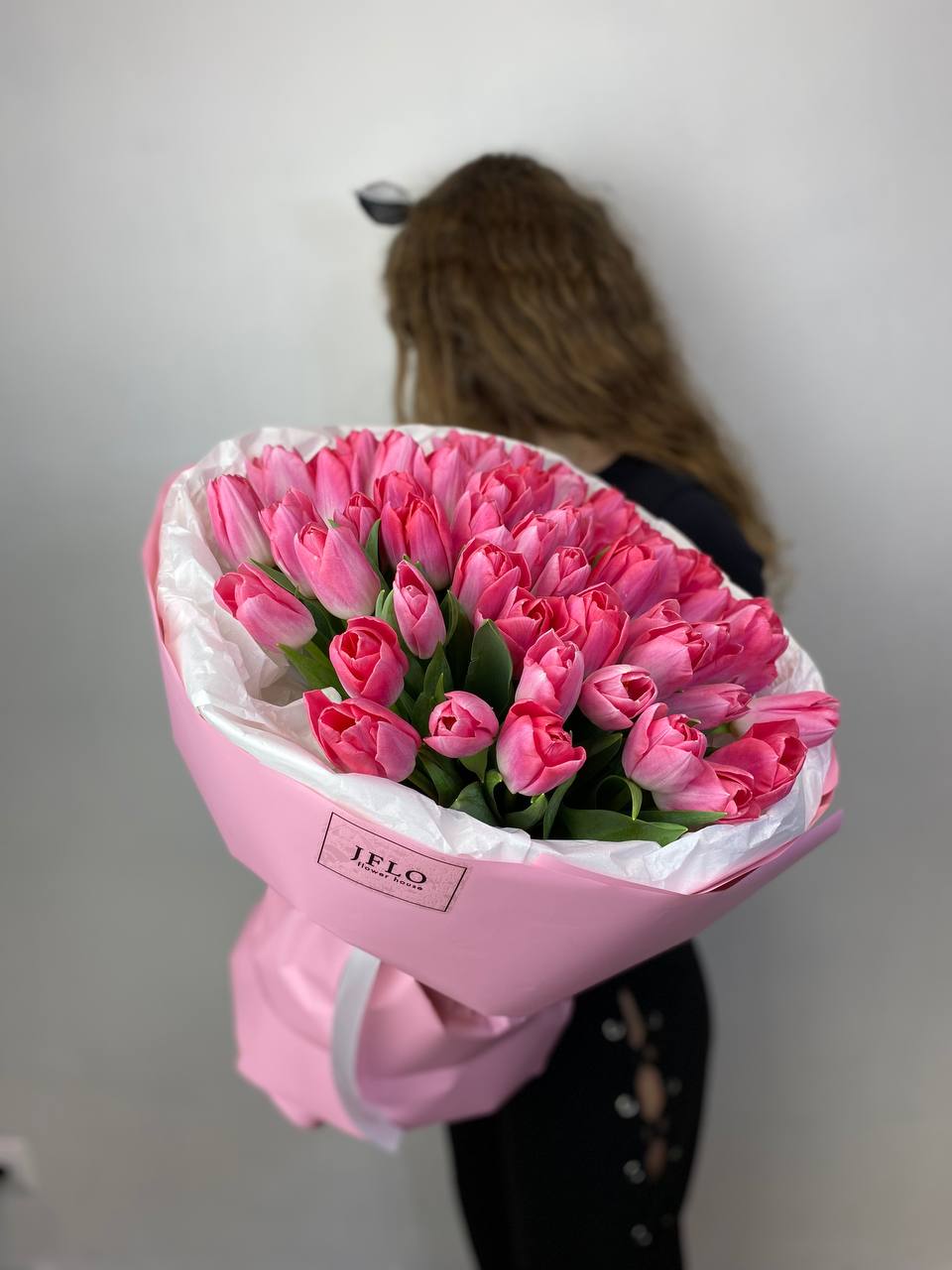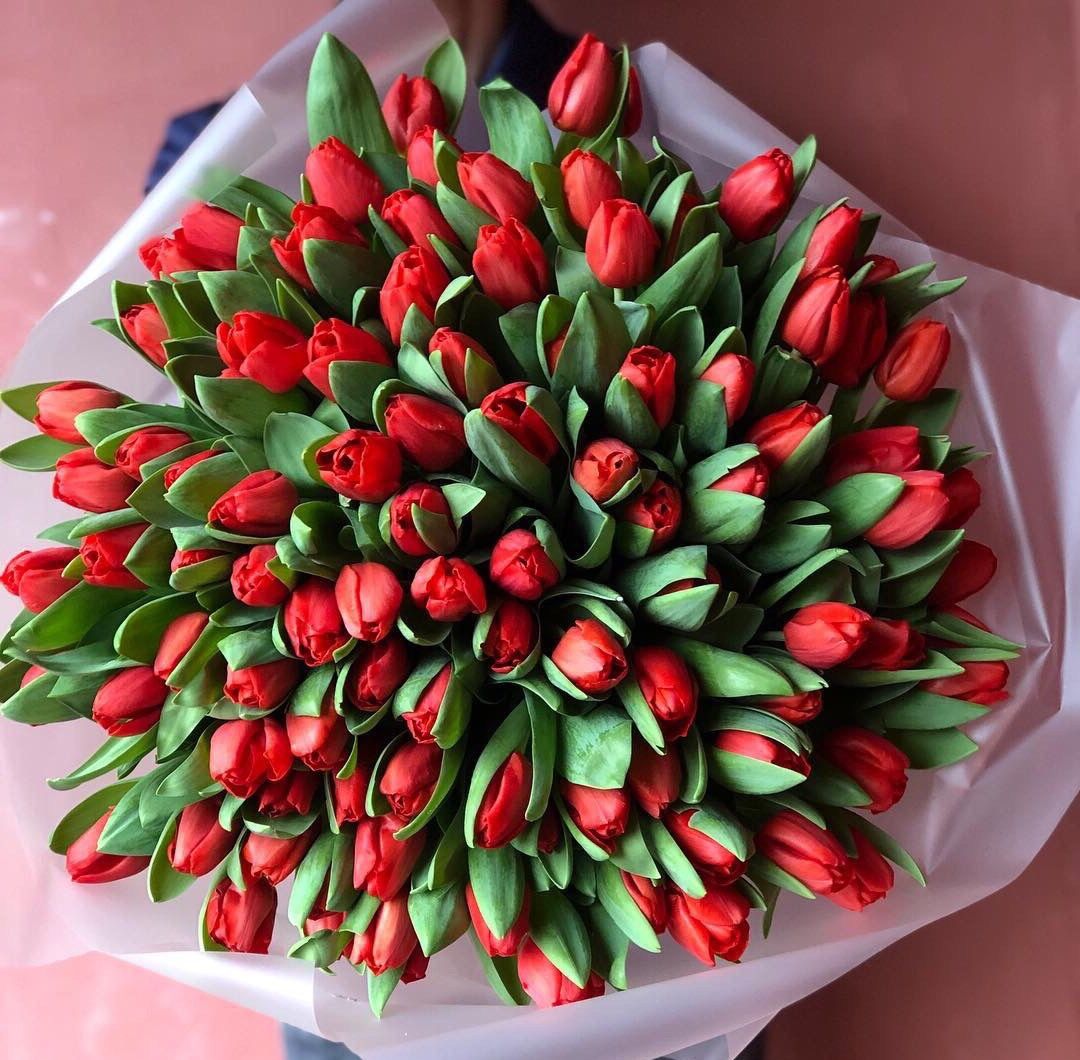 Сто один тюльпан ярко-красного цвета собраны в плотную вертикальную композицию. Весенняя свежесть и насыщенный оттенок лепестков создают мощное цветовое пятно, которое оживляет любое пространство.