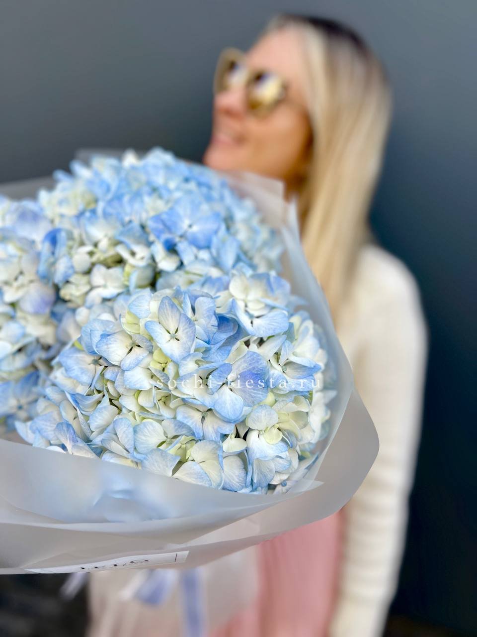 Гортензия и кустовые розы соединяются с веточками эвкалипта и ваксфлауэра в свободной композиции. Разная плотность соцветий создаёт живой ритм и природную лёгкость.