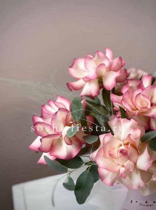 гортензия, кустовые розы, эвкалипт, ваксфлауэр (или аналог), лента, цилиндр D20.