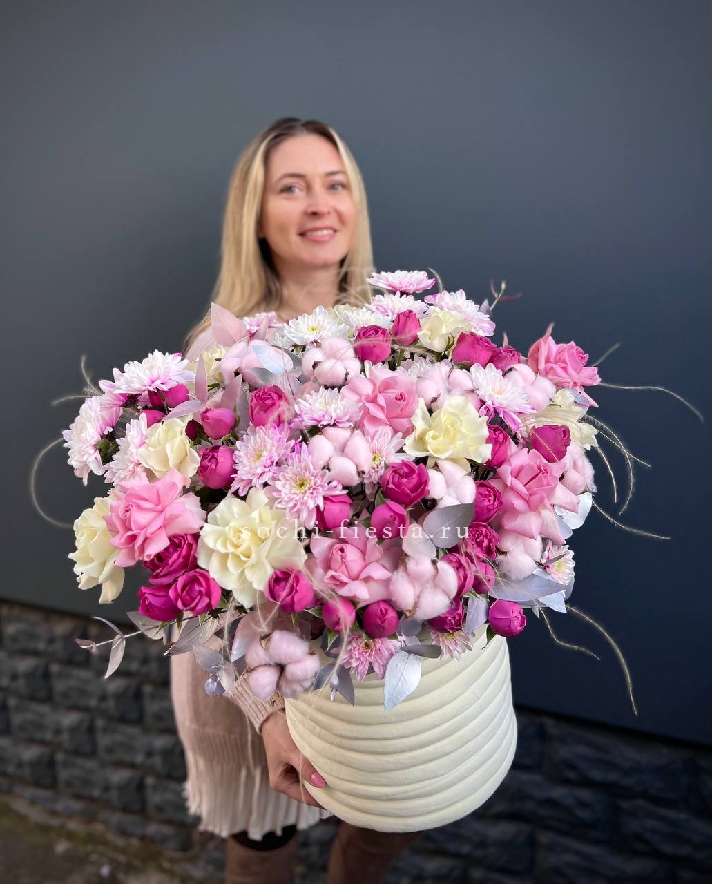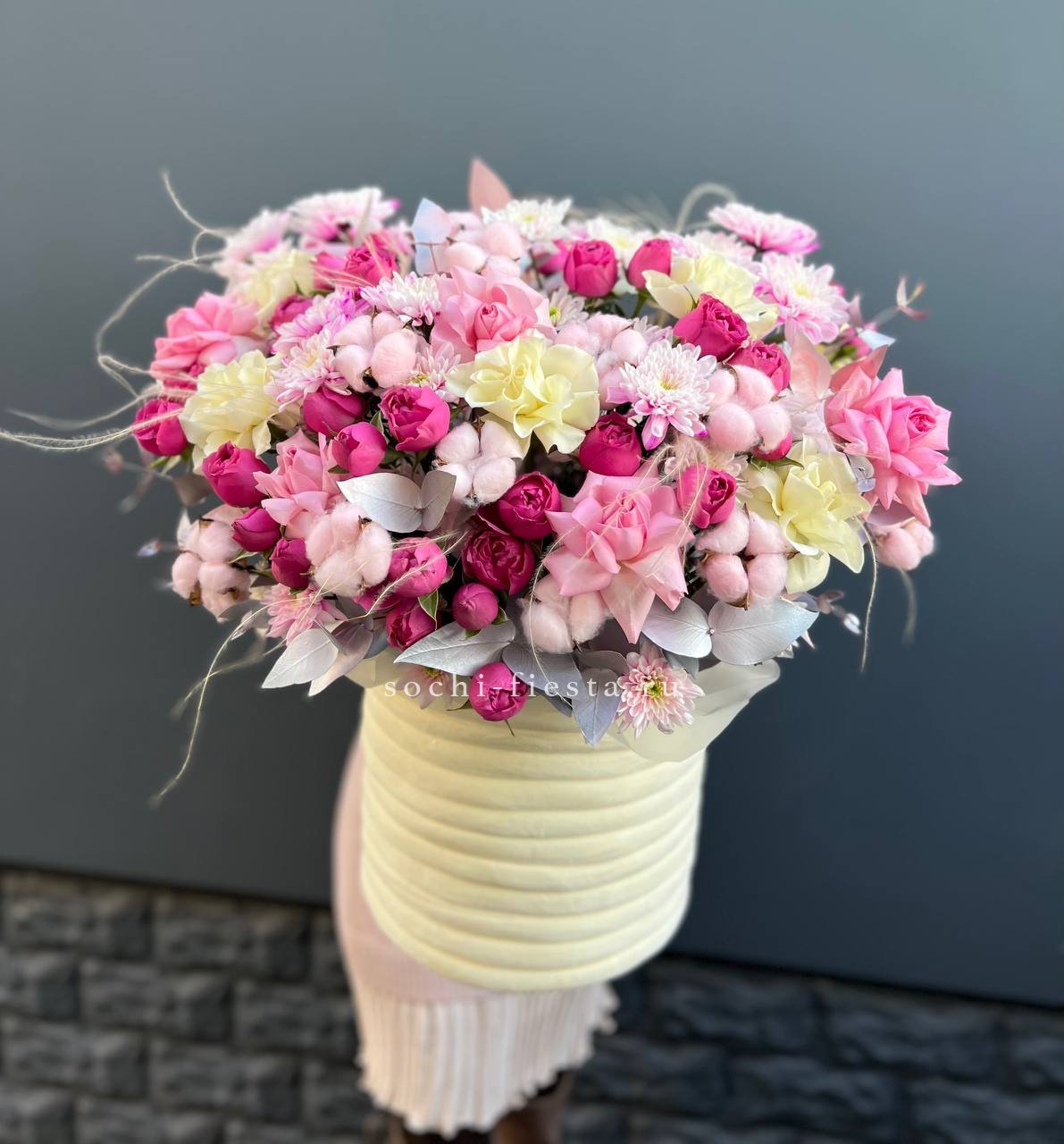 лилии, диантусы, статица, пионы или замена в не сезон эвкалипт, цилиндр.Состав может меняться в зависимости от сезона.