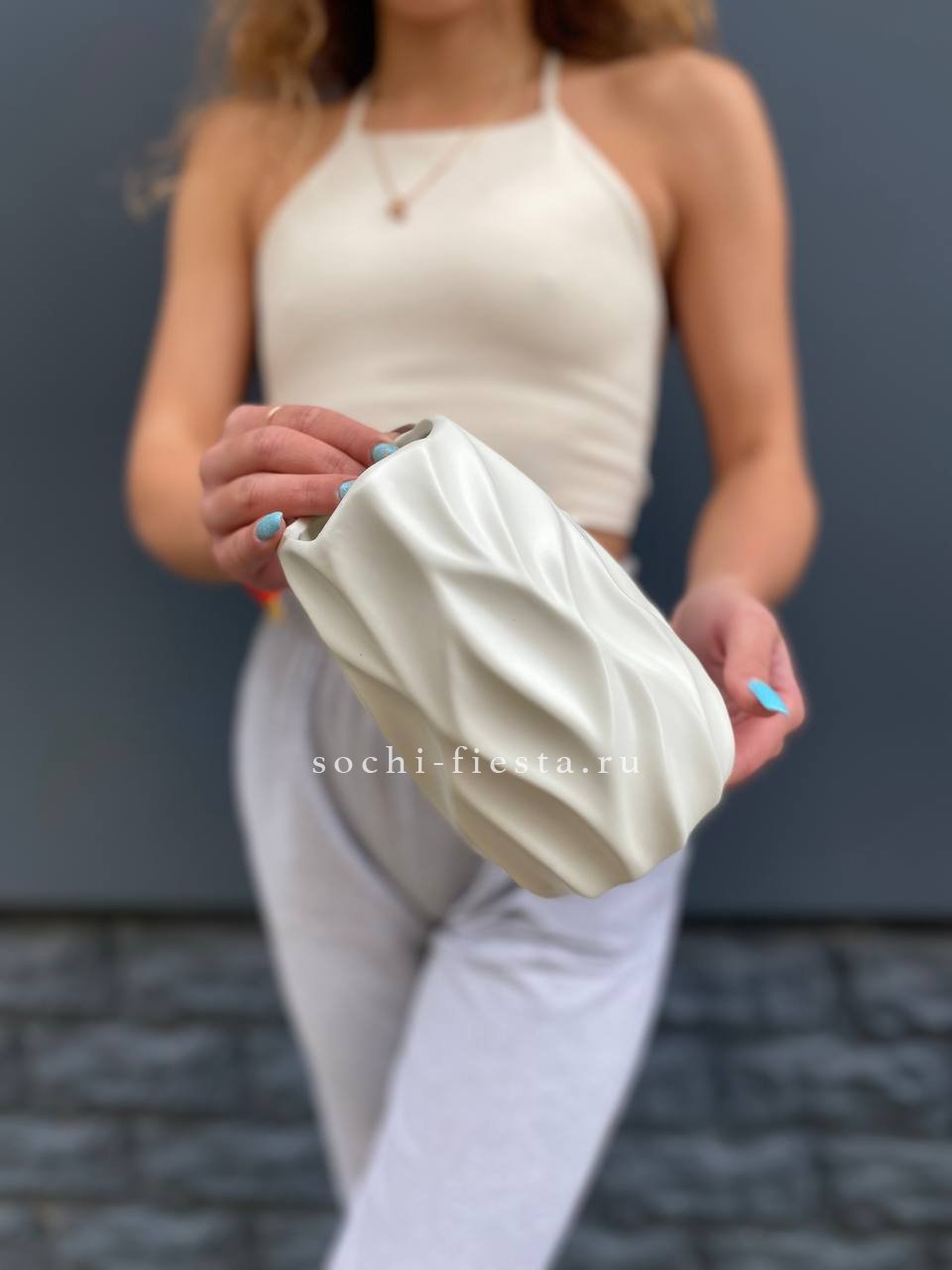 Геометрический рисунок на белой керамике выстраивает графичный ритм по поверхности. Лаконичная форма удерживает внимание за счёт фактурной игры линий и плоскостей.