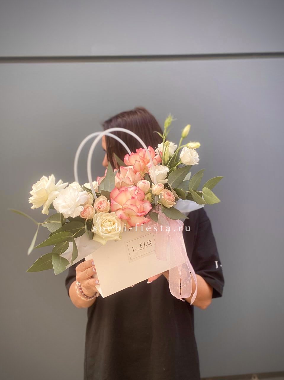 розовая и белая розы, пионовидная роза, кустовые розы, эвкалипт, лента, сумка.
