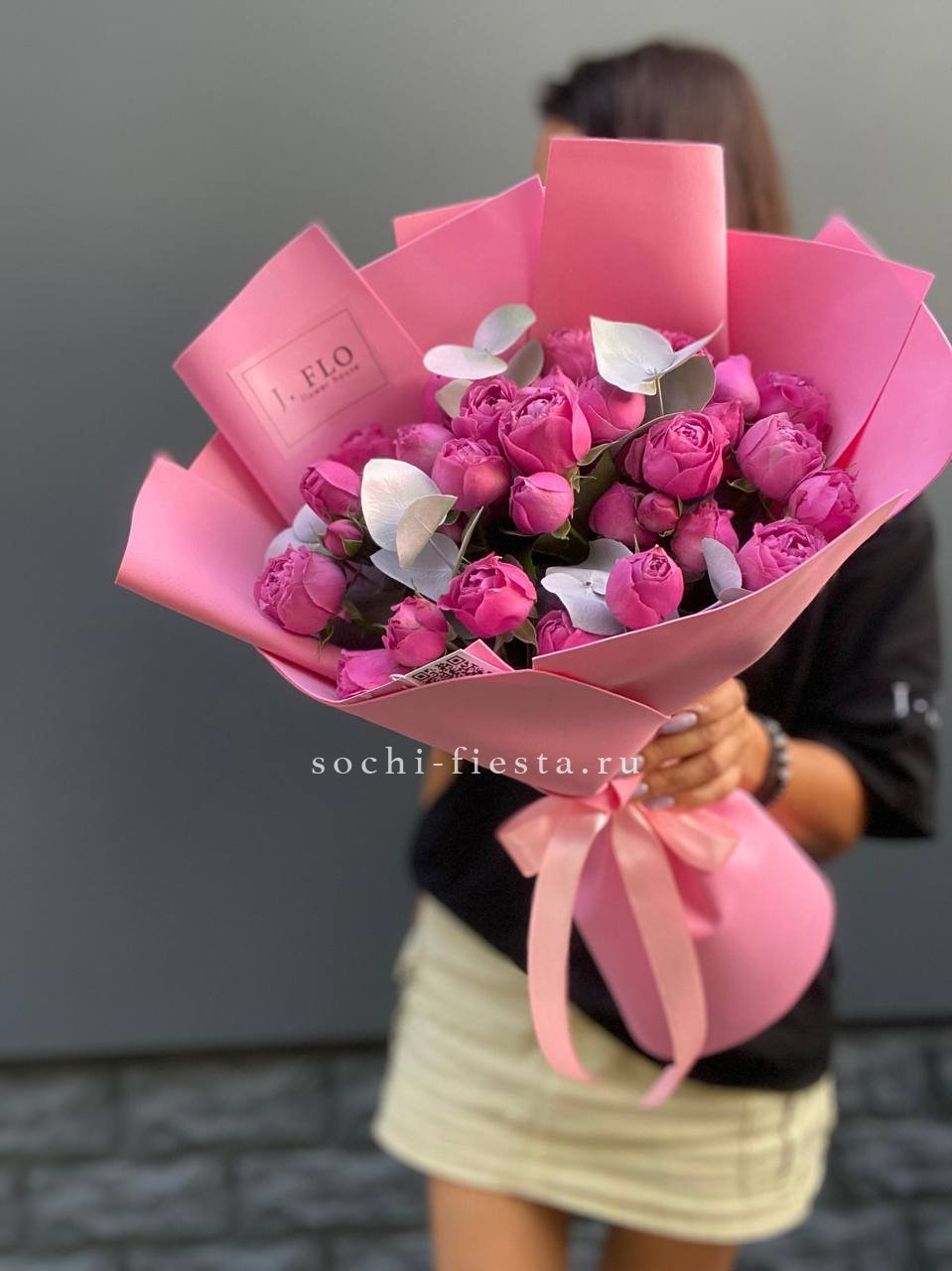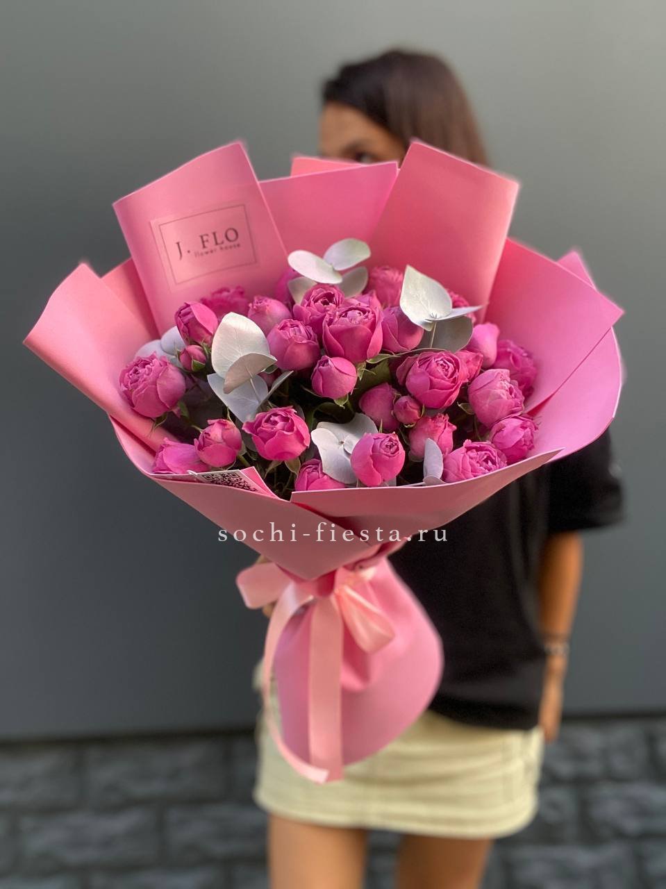 кустовые пионовидные розы Бомбастик, эвкалипт, цилиндр D13, бумага тишью, лента.
