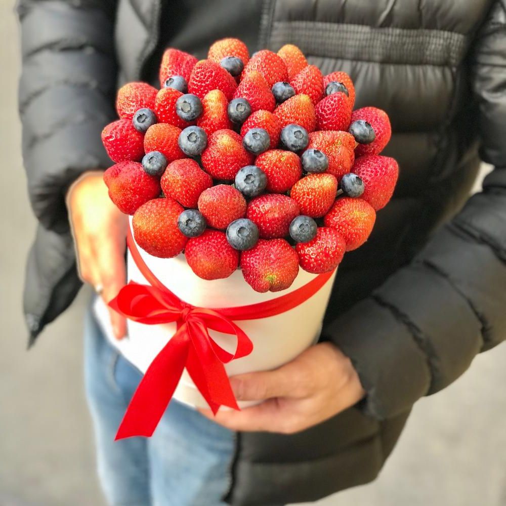 Ароматная клубника и голубика уложены в цилиндр плотными рядами. Каждая ягода на виду, композиция держит форму и выглядит как десерт.