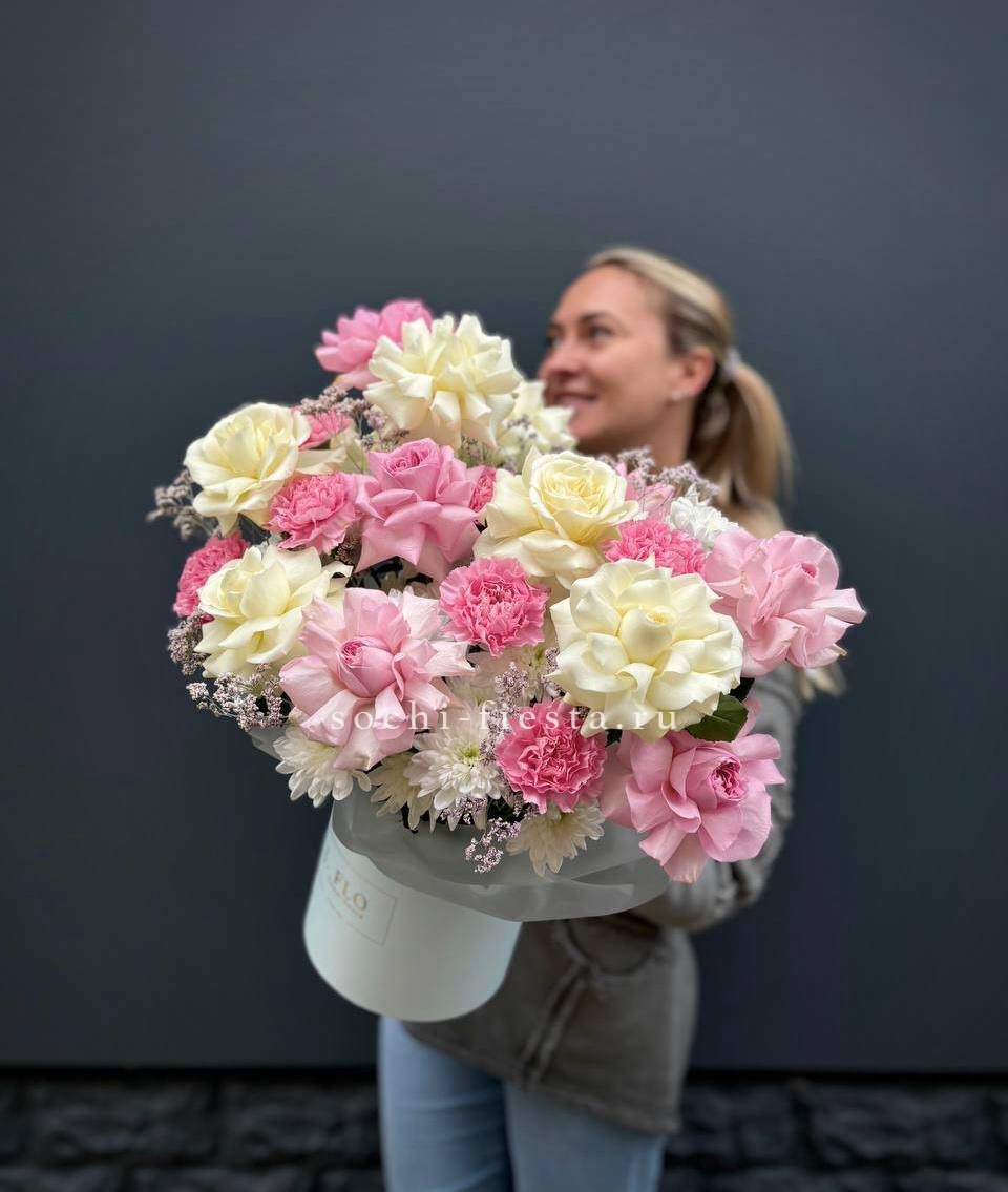 Для заказа товара "Коробка французских роз и диантусов "Бони"" с доставкой в Ижевске нажмите в корзину