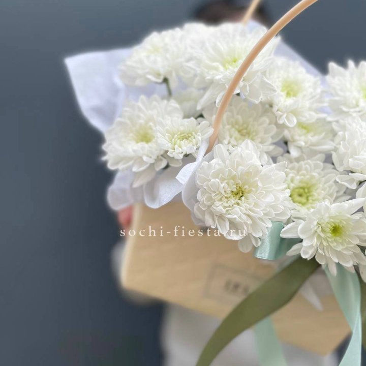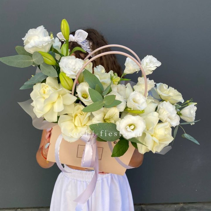 Коробка — плотный картон с матовой поверхностью. Внутри — флористическая губка (оазис), пропитанная водой. Сверху — атласная или шёлковая лента, декоративная тесьма.