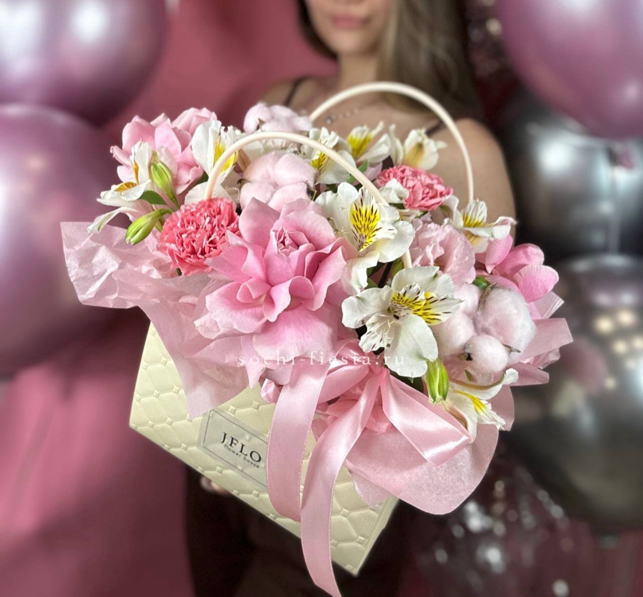 гортензия, эустома, диантусы, розы, эвкалипт и прочие цветы, гармонирующие по фактуре. Цветочная композиция в белых, нежно-сиреневых, розовых тонах в квадратном боксе D25.