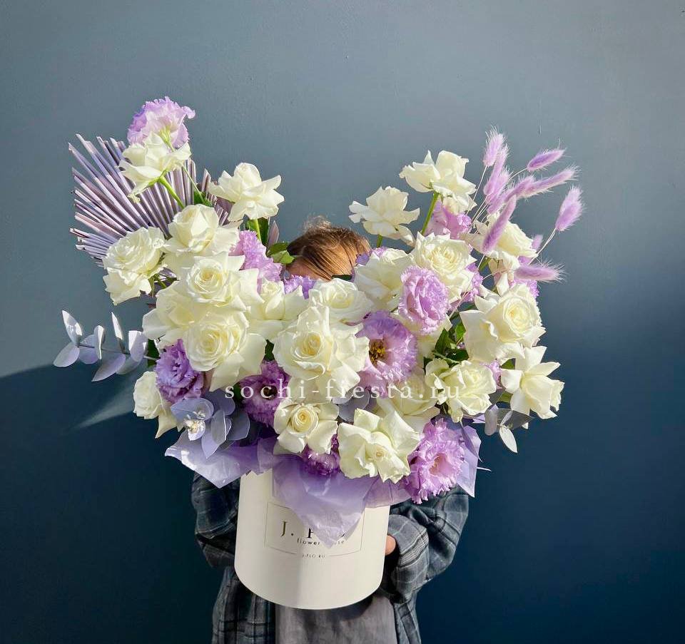 Пышная композиция с раскрытыми шапками гортензий и многослойными бутонами роз заполняет квадратный бокс. Белые и сиреневые переходы создают мягкую глубину, а эвкалипт освежает общую картину.