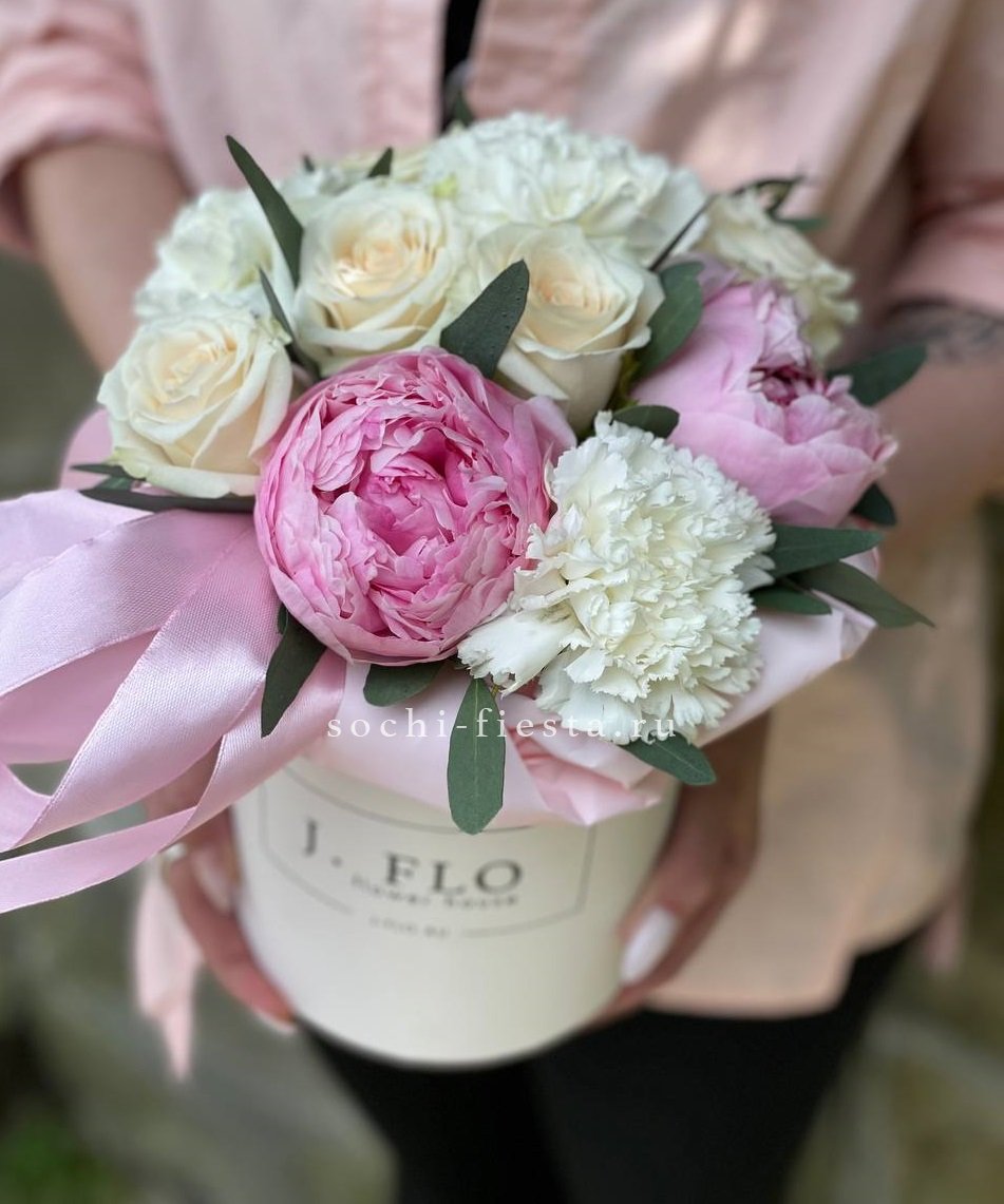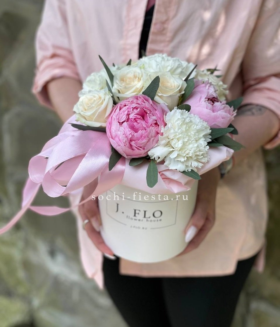 Компактная композиция с пионами и розами в круглой коробке собрана плотно и аккуратно. Диантусы добавляют воздушную фактуру между крупными бутонами. Цвет упаковки можно выбрать под интерьер или любимую палитру.
