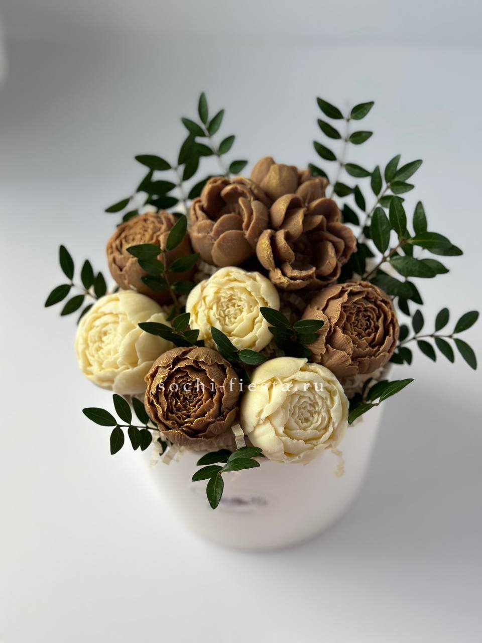 Кремовая палитра с переходами в цвете создаёт мягкое свечение композиции. Гортензия и эустома образуют воздушную текстуру, а кустовые розы добавляют объём. Деревянный ящик завершает природную эстетику.