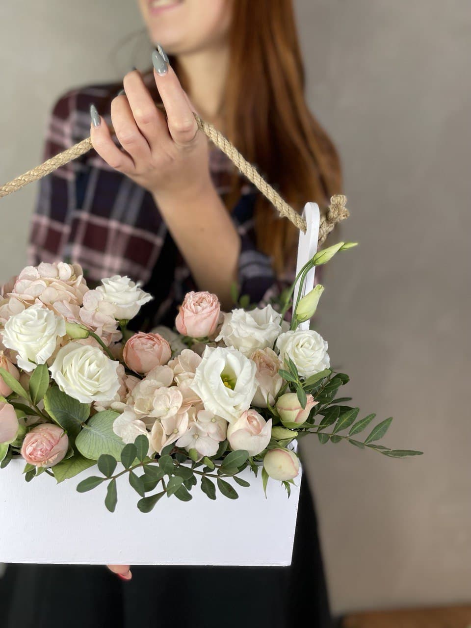 гортензия, диантус, кустовая роза, эустома, эвкалипт, гипсофила/бруния/хамелациум, деревянный ящик, пиафлор, лента Состав композиции может быть незначительно изменен флористом в процессе изготовления с соблюдением стилистики, фактуры и цветовой гаммы оригинала.