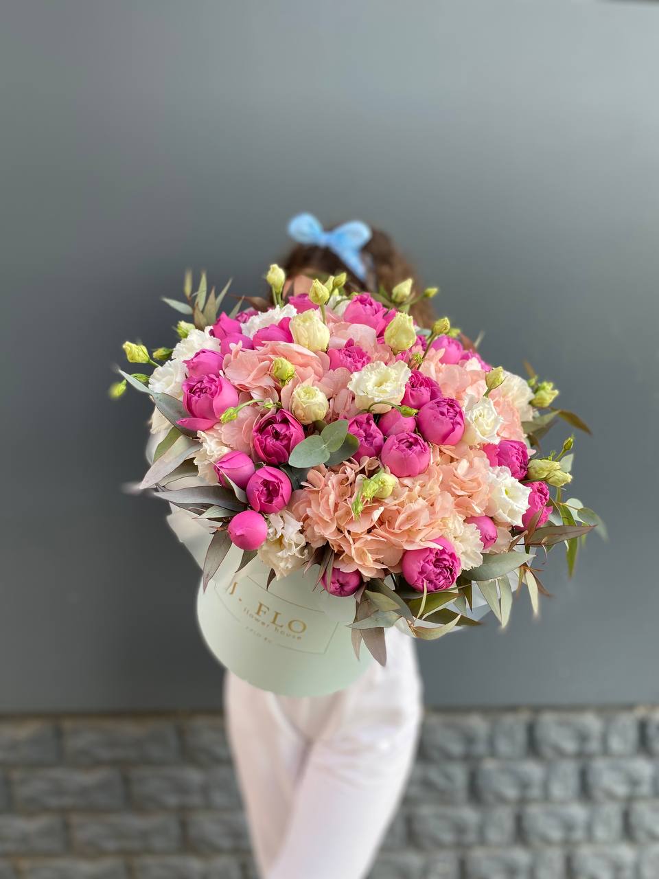 Пионовидные розы раскрываются пышными шапками среди воздушной гортензии и эустомы. Композиция собрана в круглом боксе и держит форму без дополнительной упаковки.