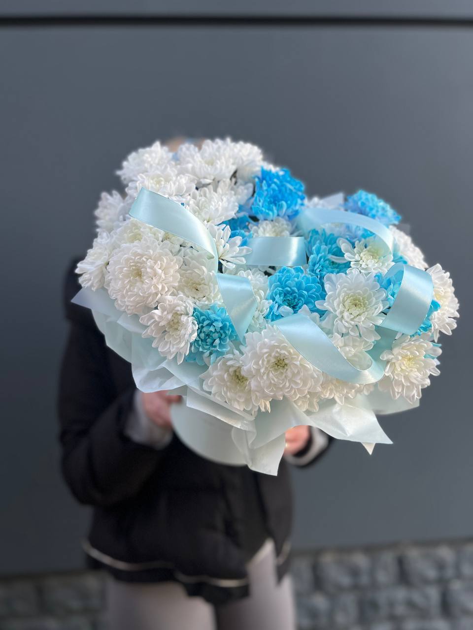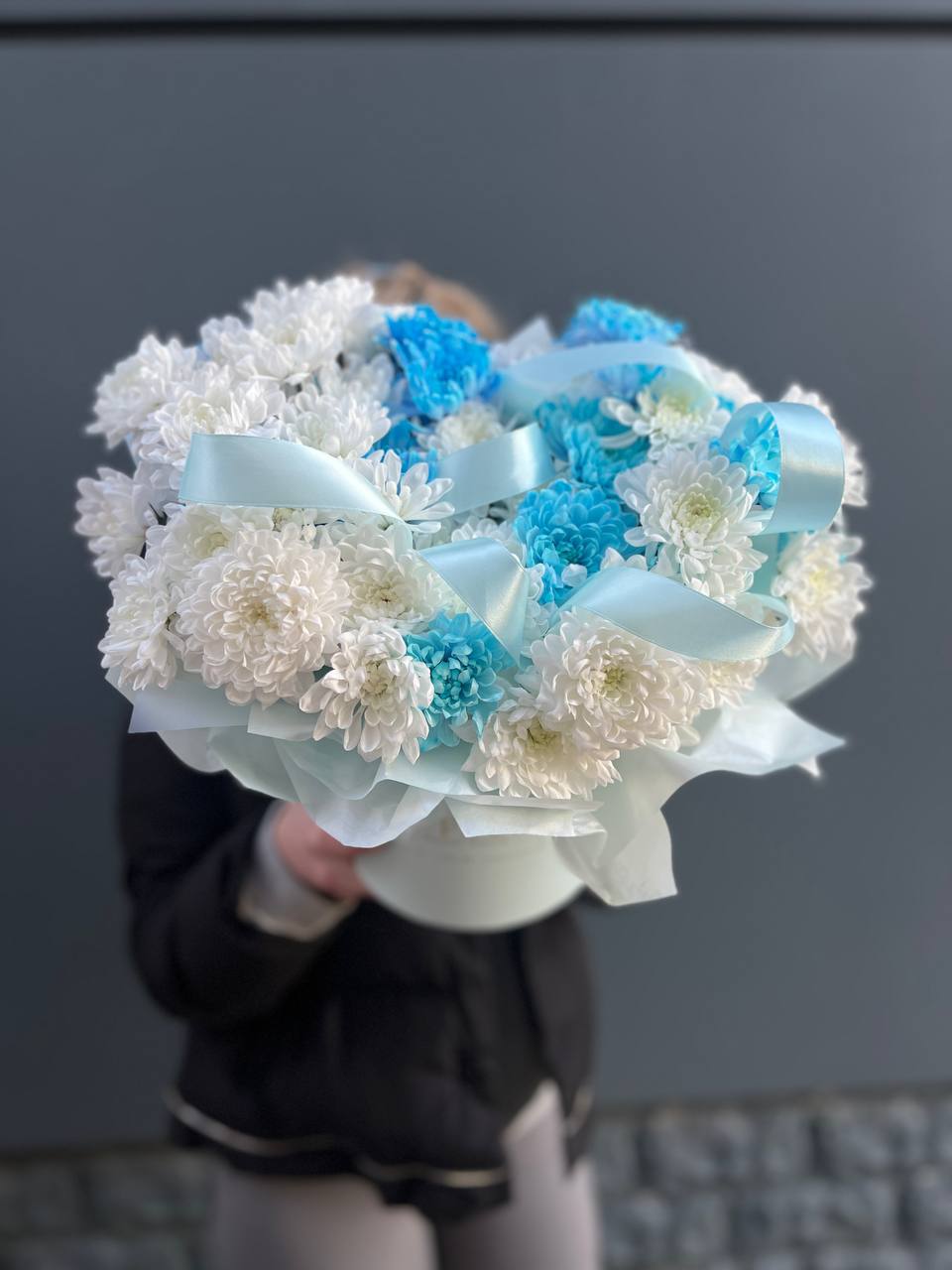 Состав: гортензия, эустома, хризантема, бомбастик, хлопок, джумилия, герберы, бокс 16, оазис.