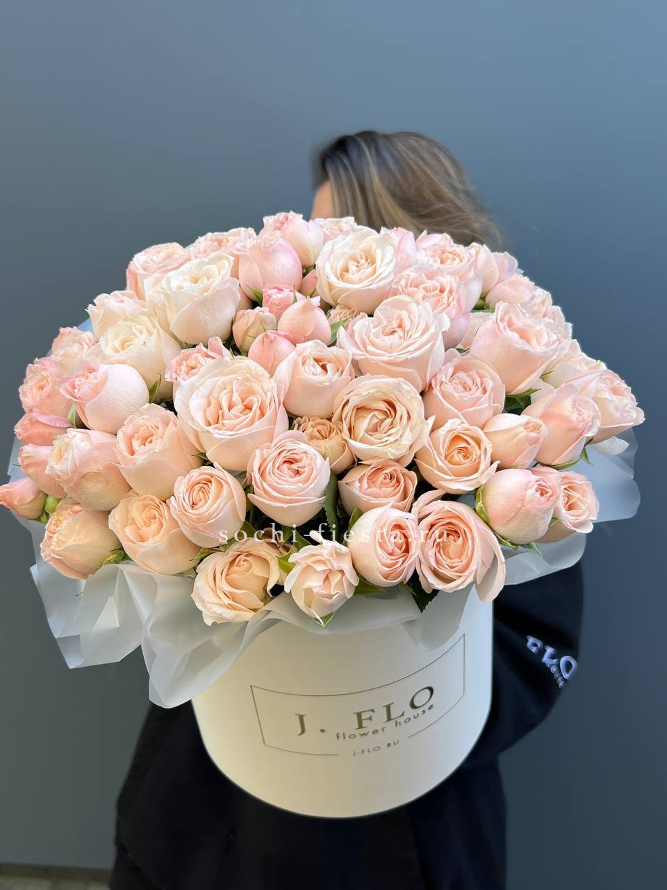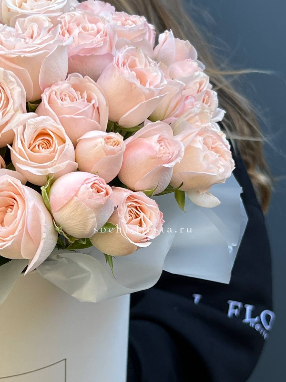 Тридцать одна веточка кустовой розы Бомбастик собрана в пышный объём. Махровые бутоны формируют dense структуру с глубокими переливами персиковых тонов.