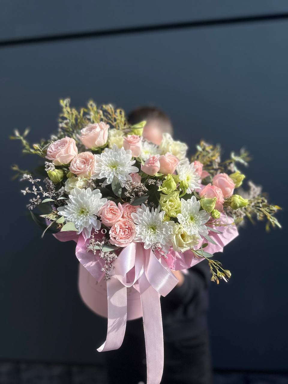 Гортензия образует пышную основу, сквозь которую проступают французские розы и лепестки эустомы. Эвкалипт добавляет свежести, а диантусы завершают картину.