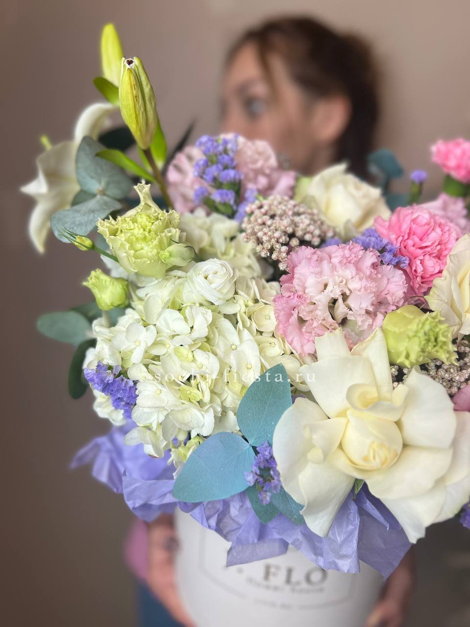 французские розы, кустовые розы, диантусы, матиолла, лагурус, цилиндр D20,  бумага тишью.