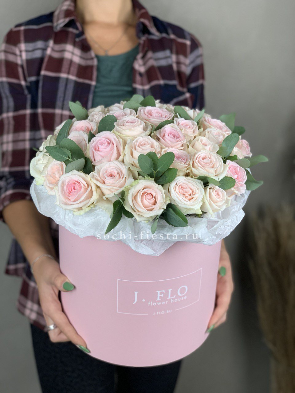 Розовая палитра разворачивается слоями в просторном цилиндре. Композиция выстроена по вертикали и держит объем за счет разной высоты бутонов и зелени.