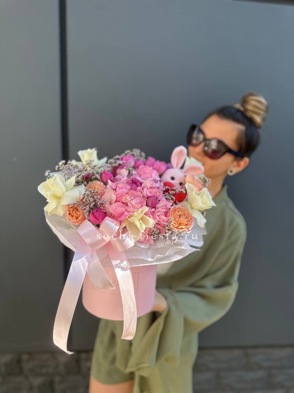 Настоящий взрыв цвета и позитива! Эта пышная и многосоставная композиция в стильной коробке притягивает взгляды богатством форм и оттенков — от нежно-розового до насыщенного белого. Это не просто цветы, а целая история о радости, празднике и восхищении. Подарок, который гарантированно произведет яркое впечатление и останется в памяти надолго.