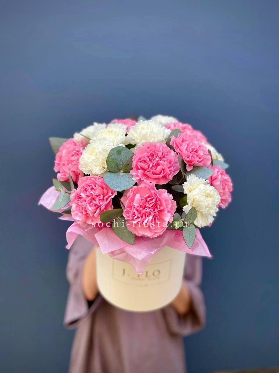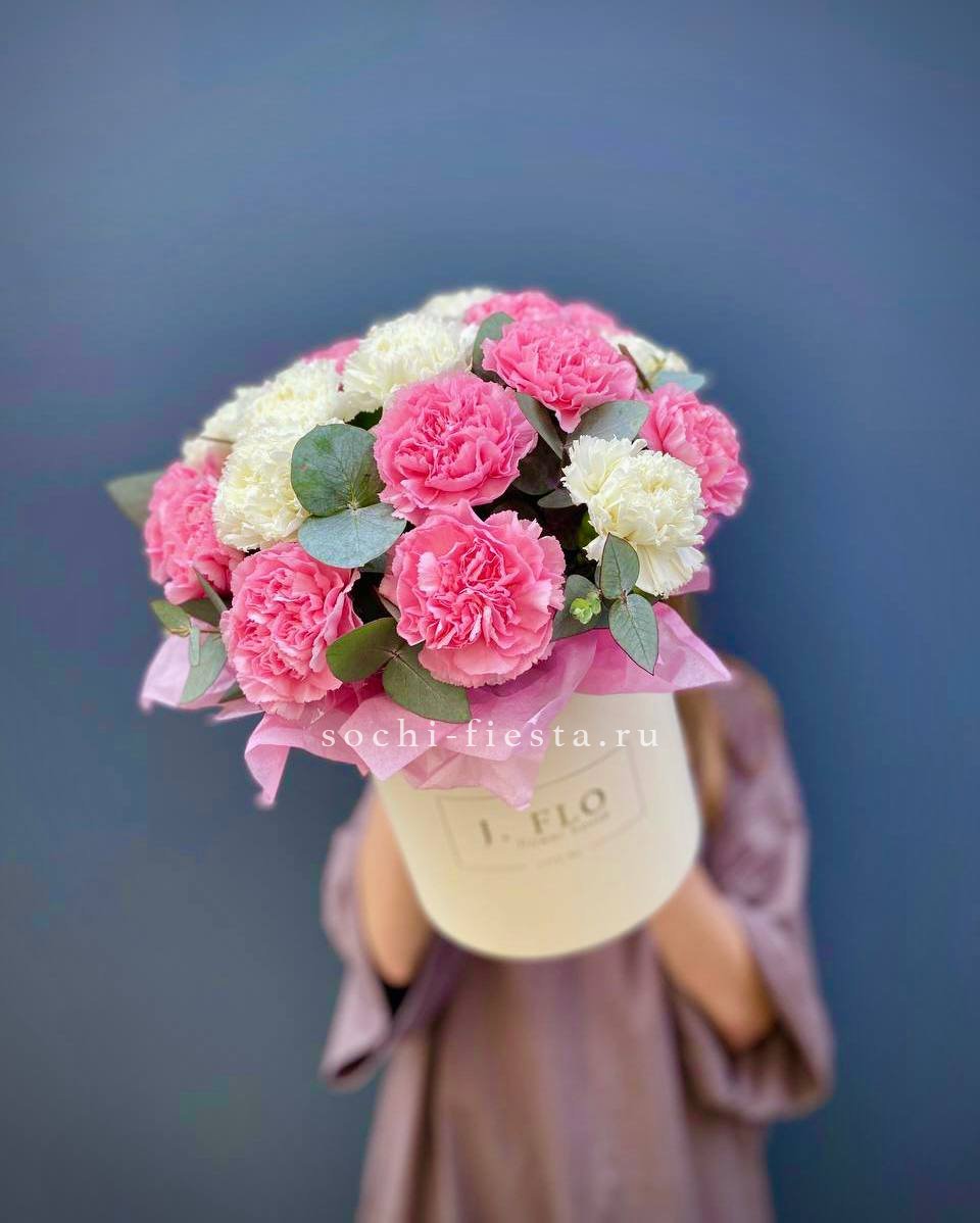 Белоснежные розы и герберы выстраивают чистую цветовую гамму с яркими акцентами диантусов. Эвкалипт вносит графичность и природную фактуру в общую композицию.