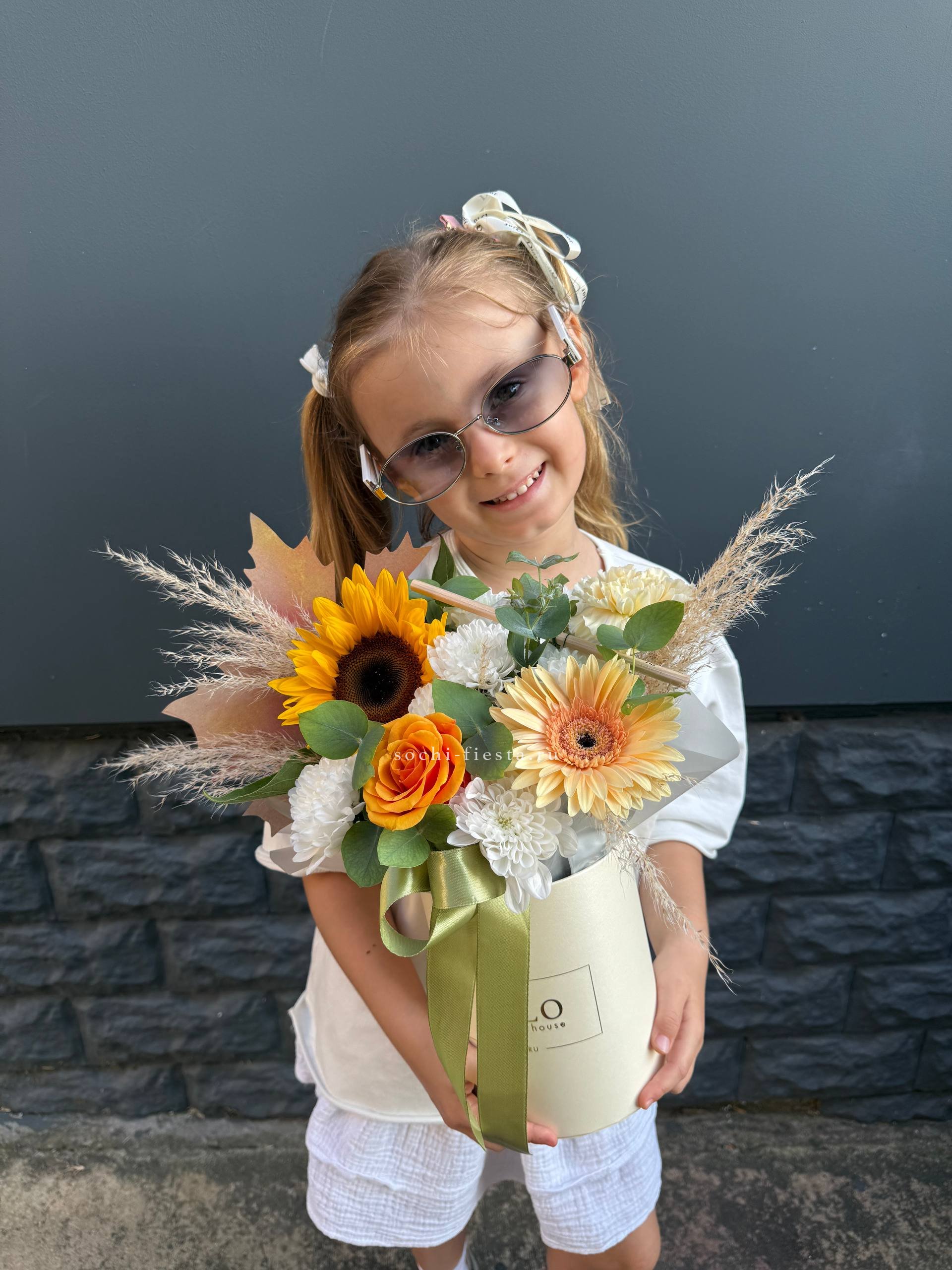 подсолнух, гербера, диантус, хризантема, роза, эвкалипт, декор, коробка D16.