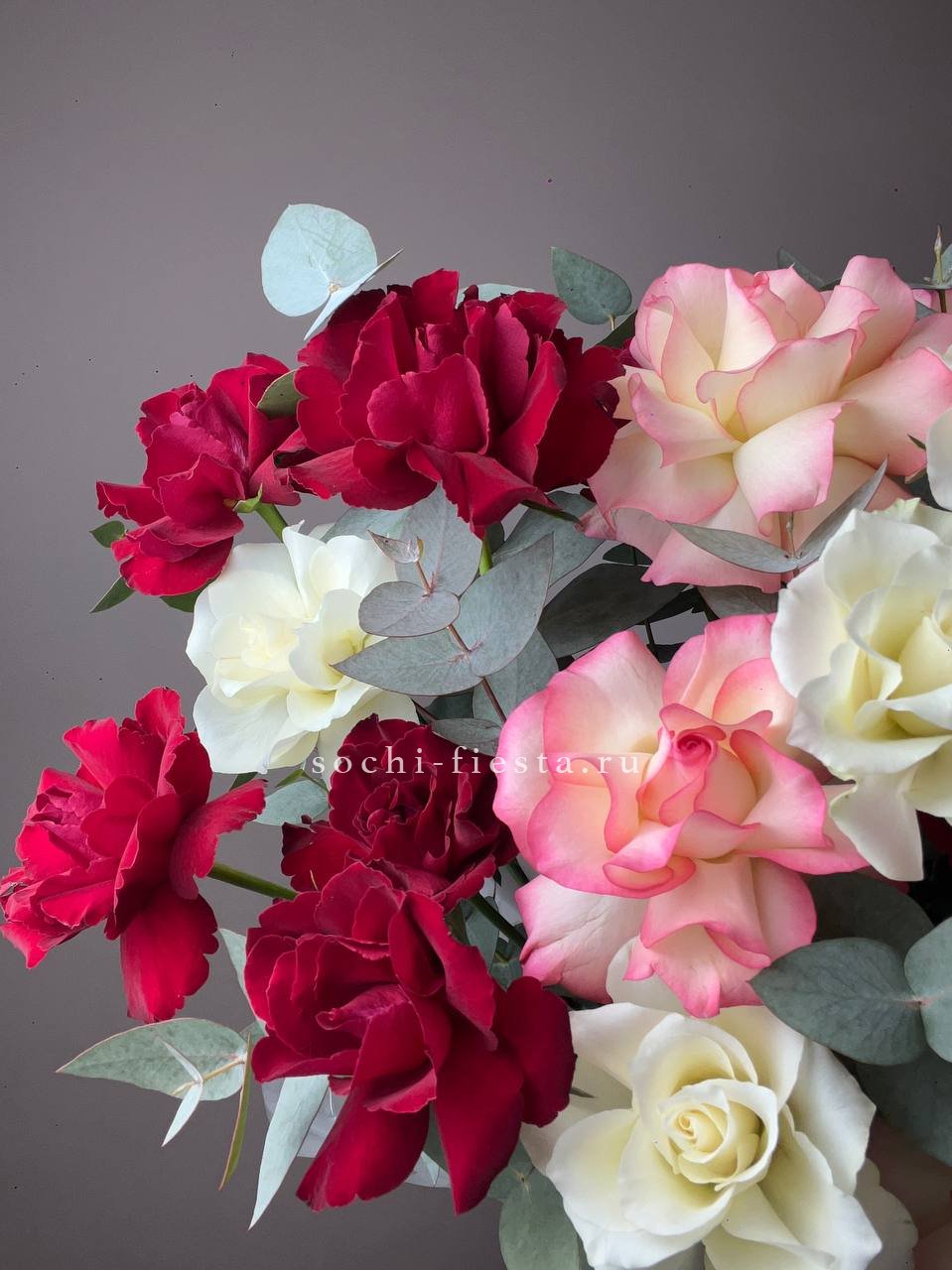 белые розы, красные розы, джумилия, цилиндр D20,  лента.