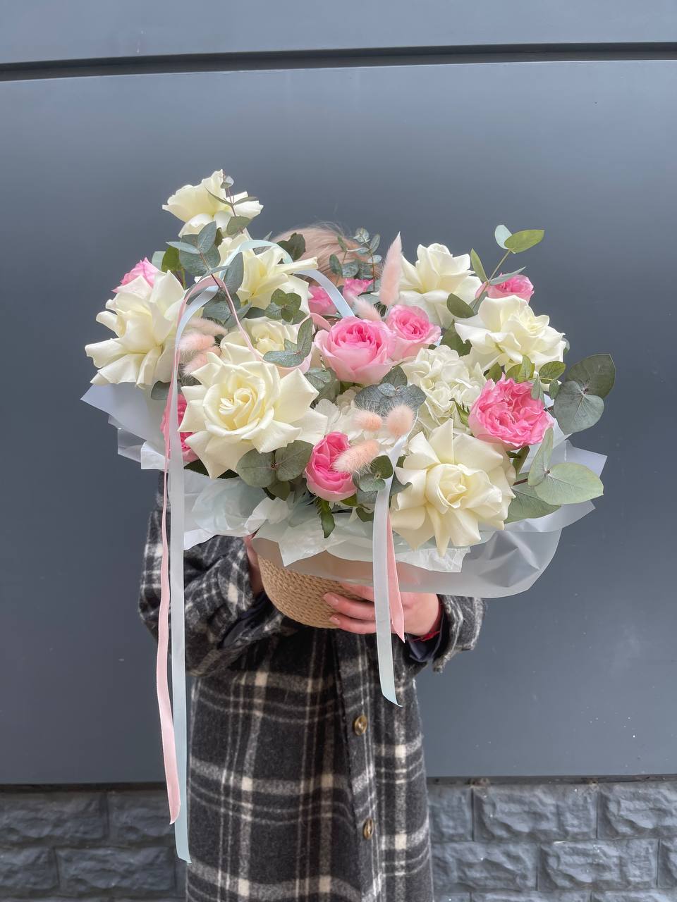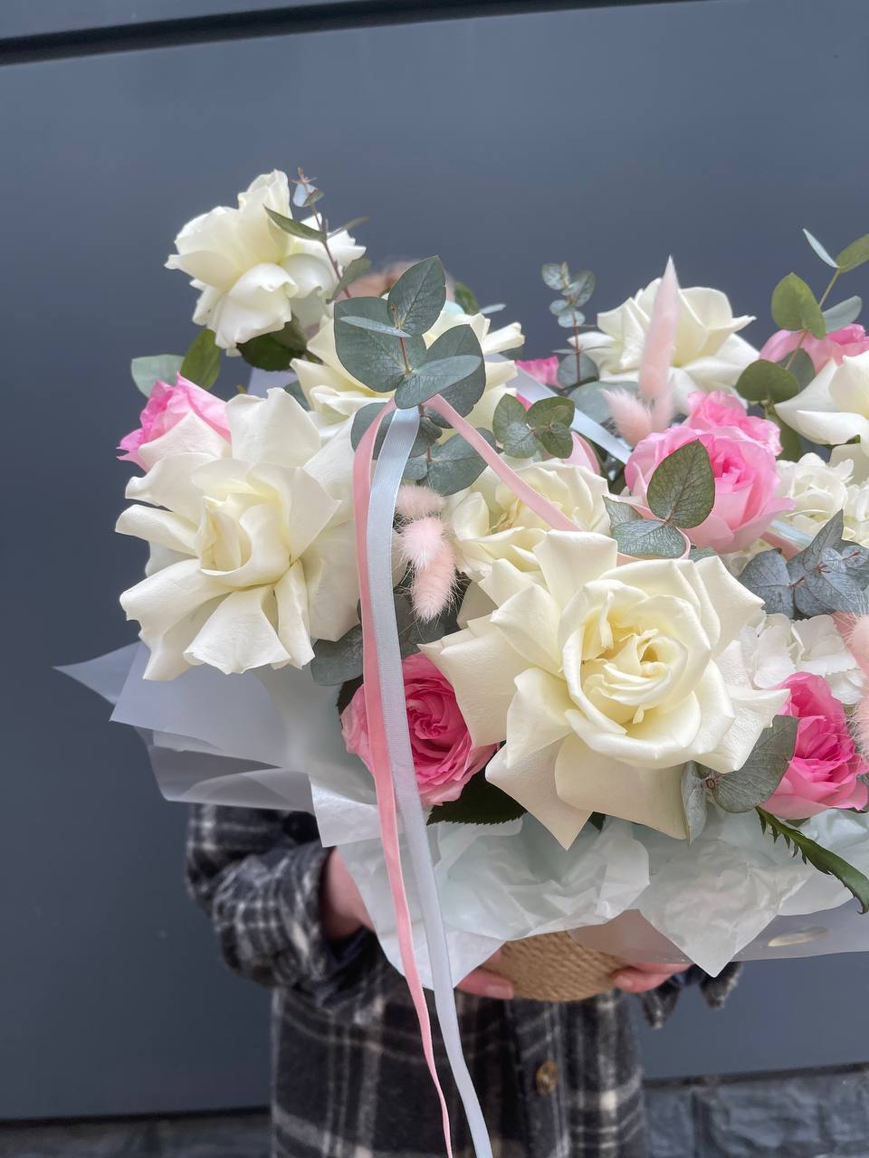 белые и кустовые розы, диантус в джутовом кашпо с эвкалиптом.