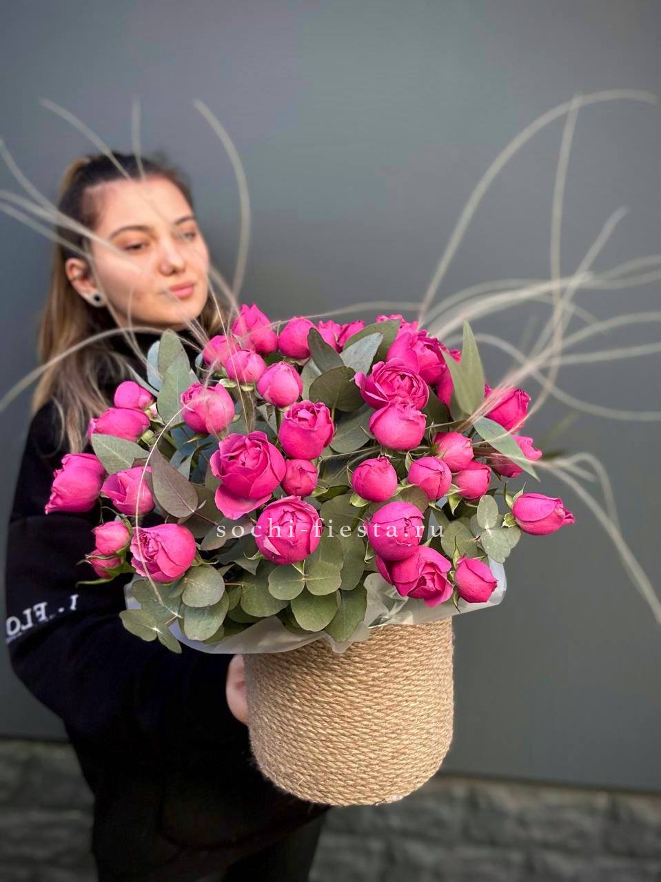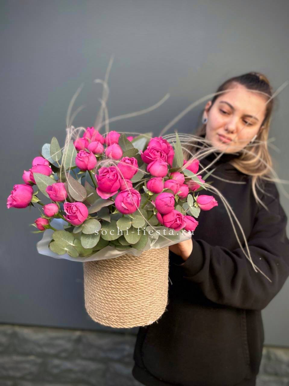 Пионовидные розы Мисти Бабблс в джутовом кашпо