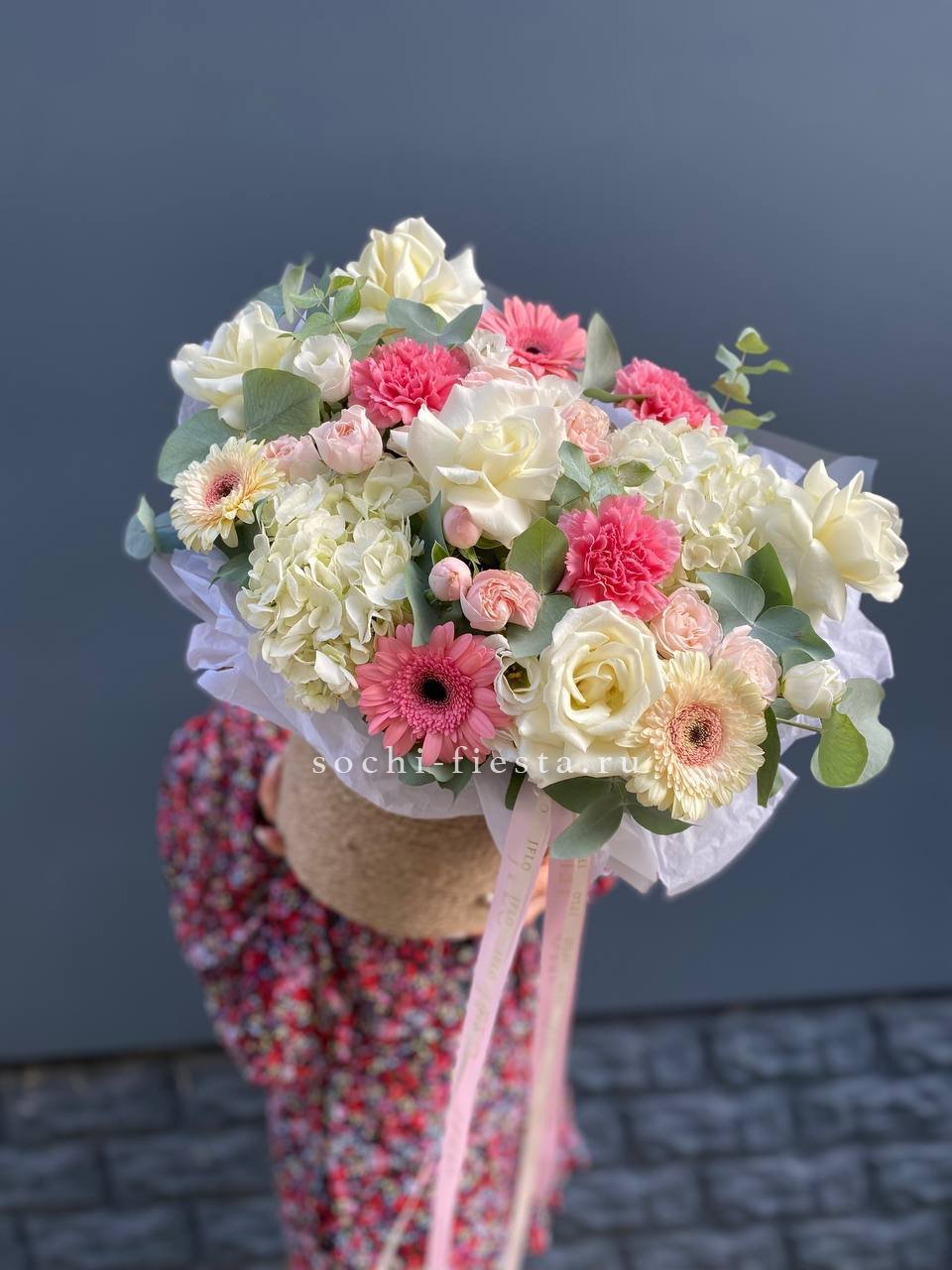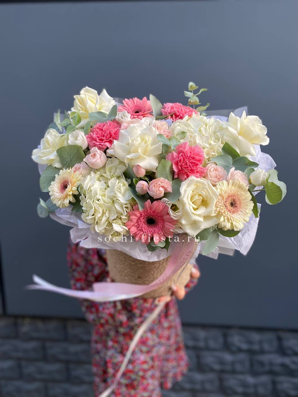 Белые розы и яркие герберы встречаются в одной композиции с диантусами и эустомой. Эвкалипт добавляет зелени, а джутовое кашпо завершает природный образ букета Georgino.
