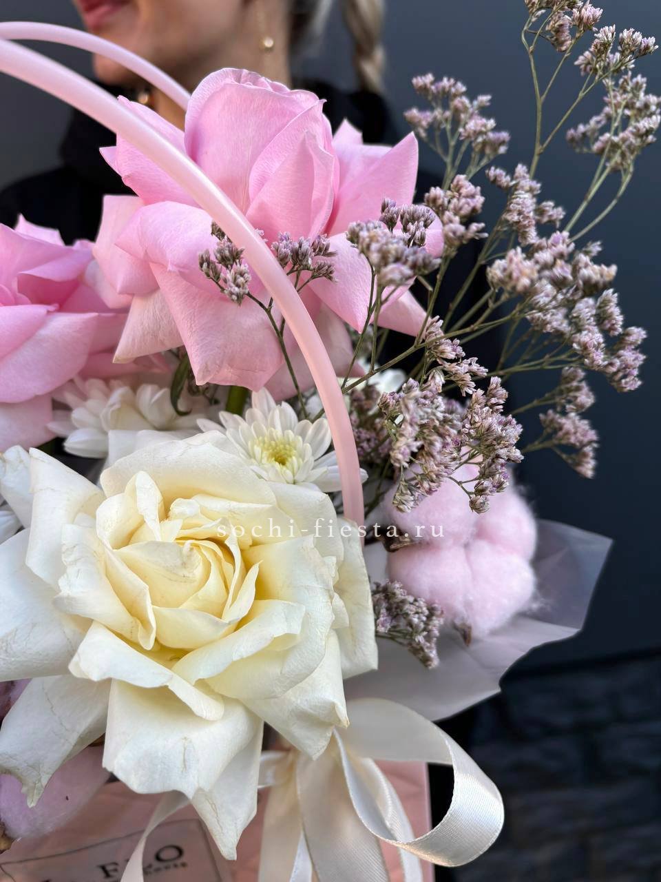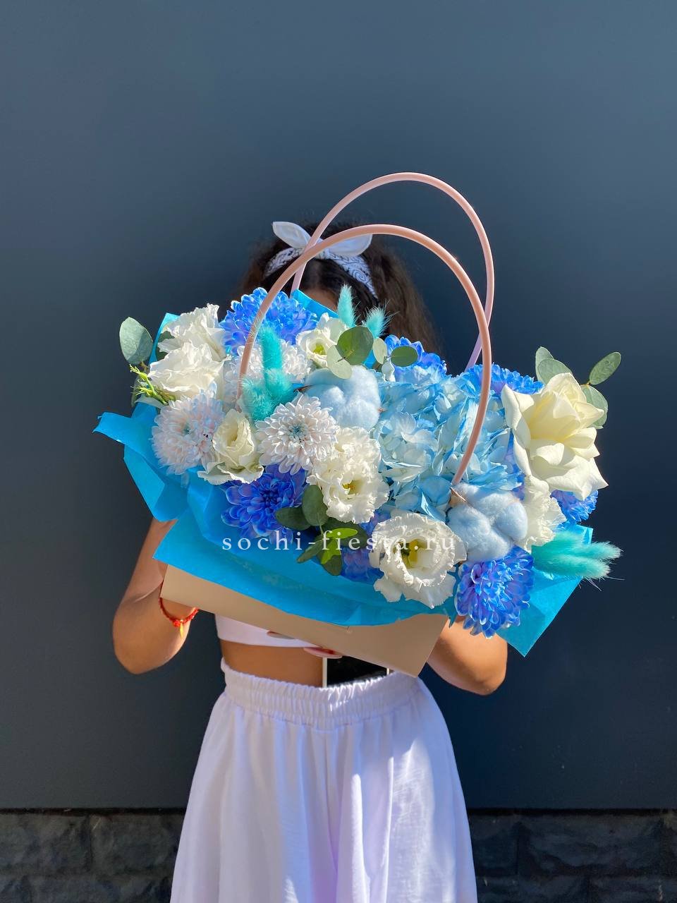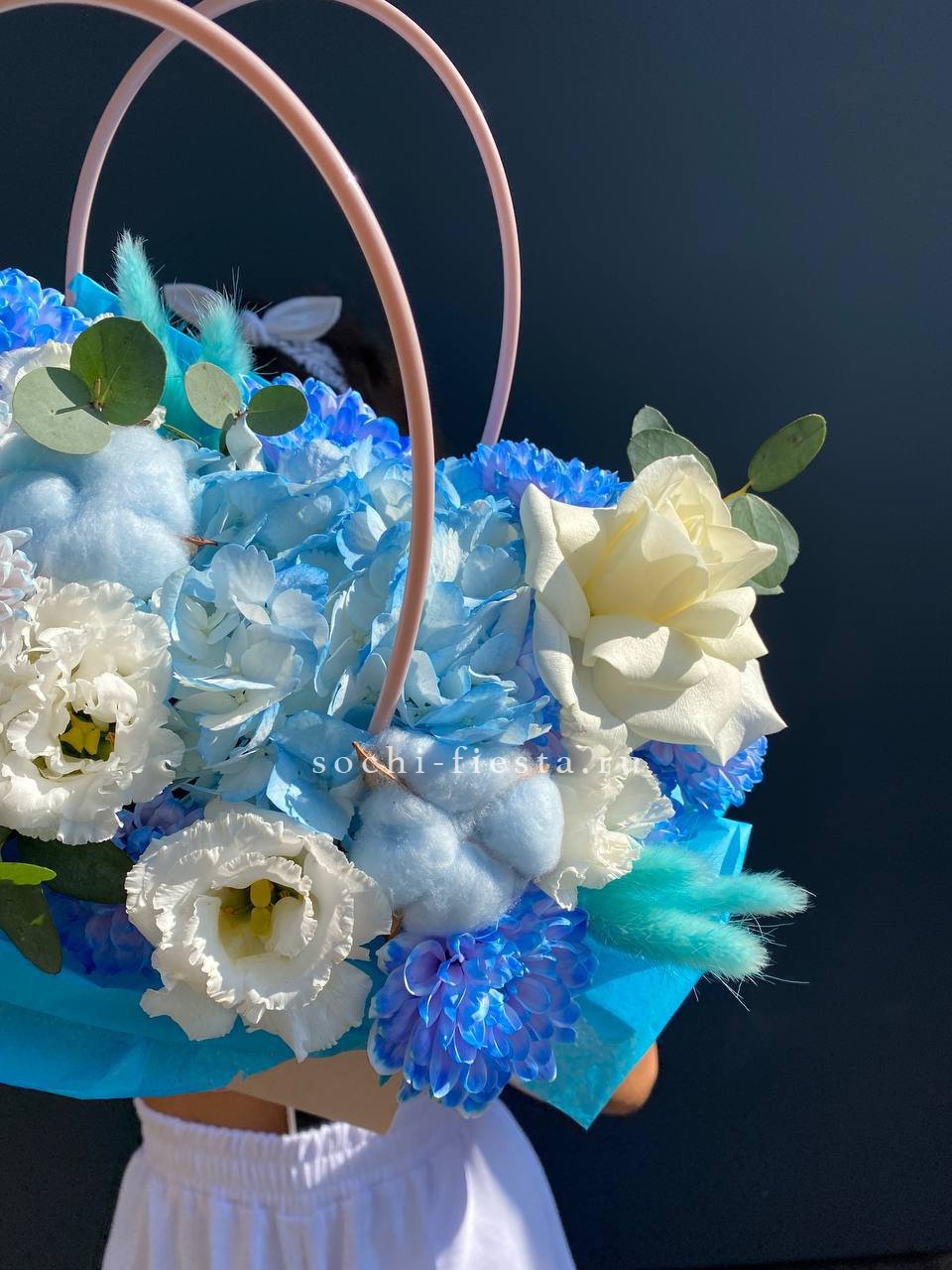 Голубая хризантема в компании воздушного лагуруса напоминает о прохладе летнего утра. Компактная форма в сумочке позволяет разместить цветы на столе или полке без лишних усилий.
