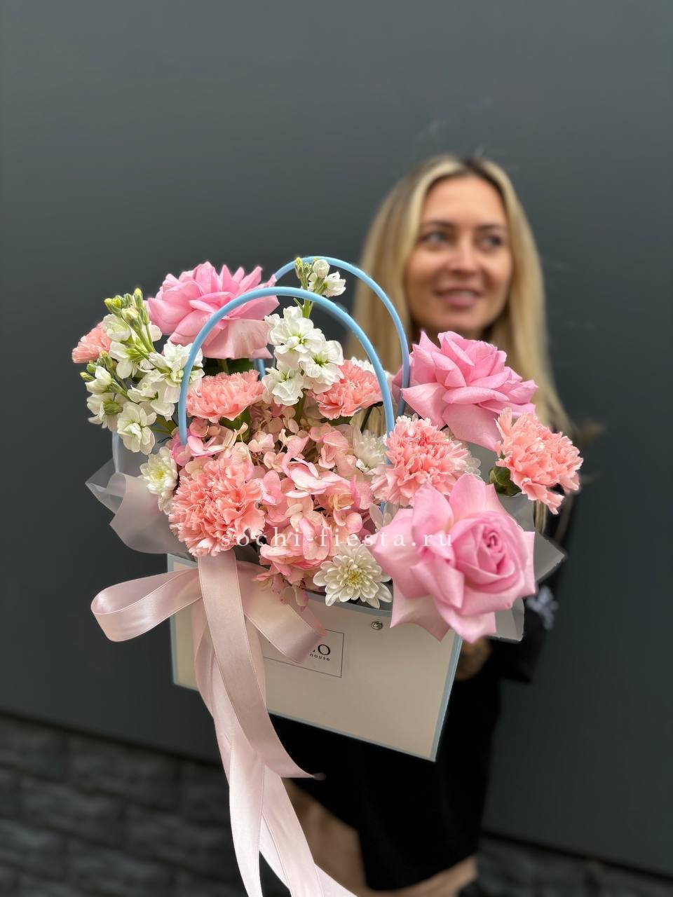 альстромерии (в зависимости от сезона, возможна замена), розовые розы, хлопок, диантусы, лента, сумка-кашпо.