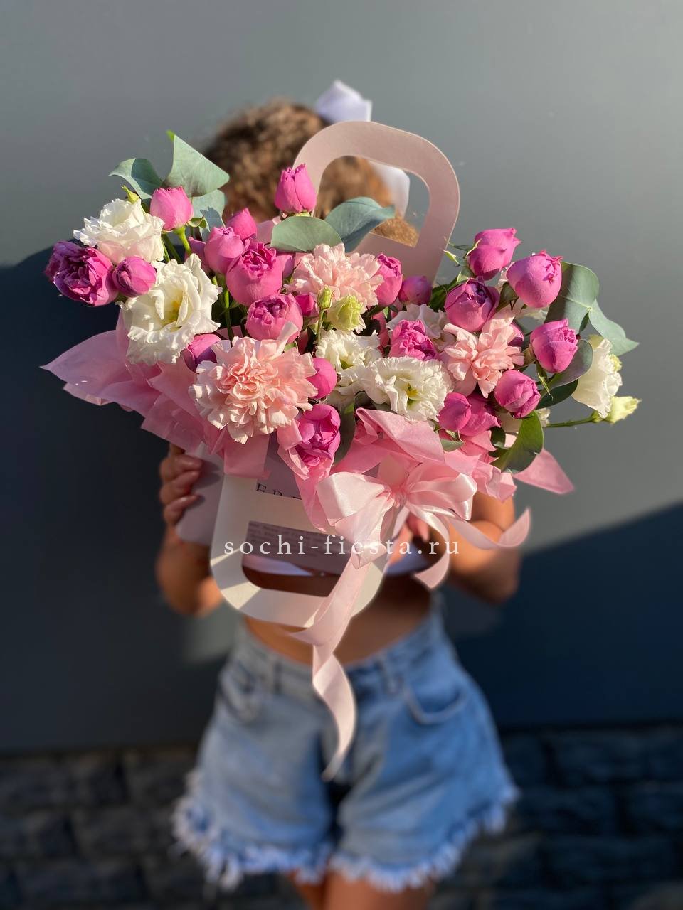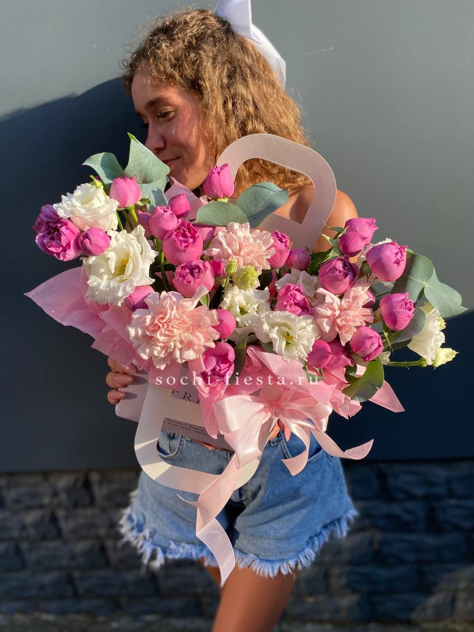 джумилия, гербера, мисти баблс, диантус, хлопок, лагурус, сумочка.