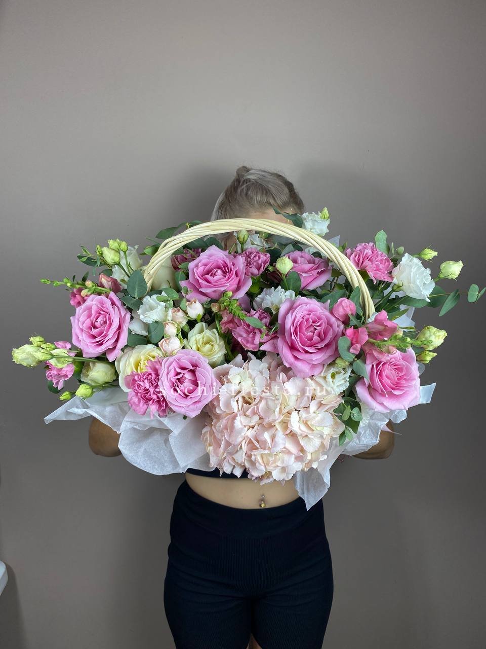 гортензия нежно-розовых оттенков, эустома, пионовидная кустовая роза, эвкалипт, диантус, антиринум, розы, лента, корзина.