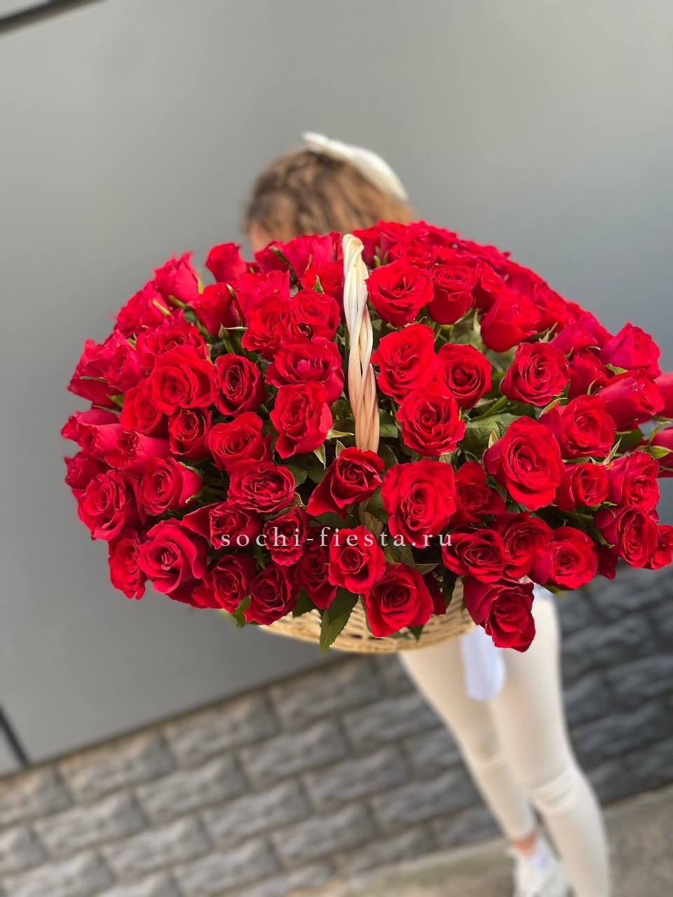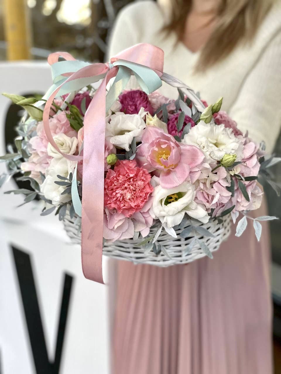 голландский пион Сара Бернар - 555 шт.,лента, светлая корзина D40.