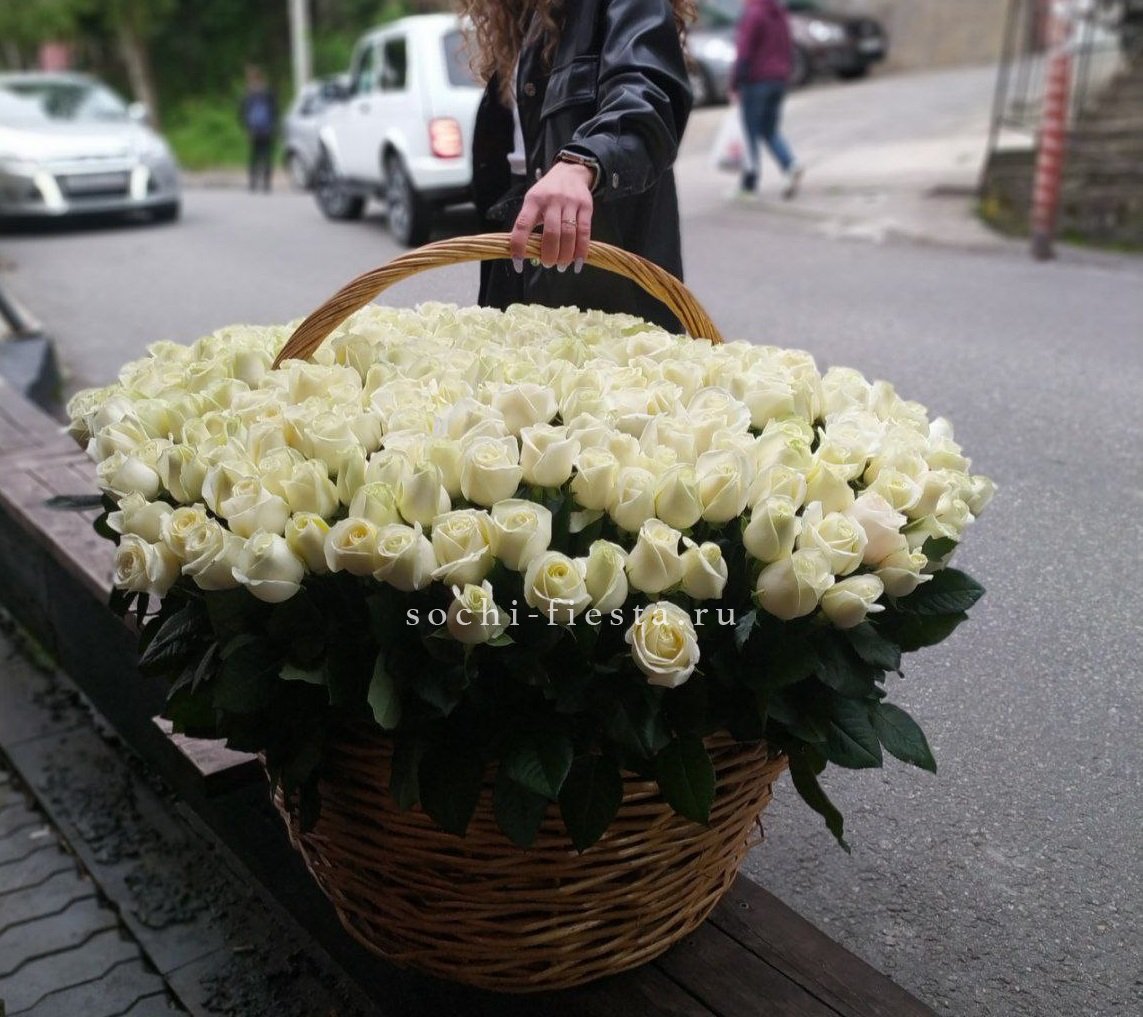 Плотная корзина с белыми розами и гортензией дополнена яркими георгинами и дельфиниумом. Воздушная гипсофила создает легкую дымку над насыщенной композицией. Завершает образ двойной бант и свежая зелень эвкалипта.