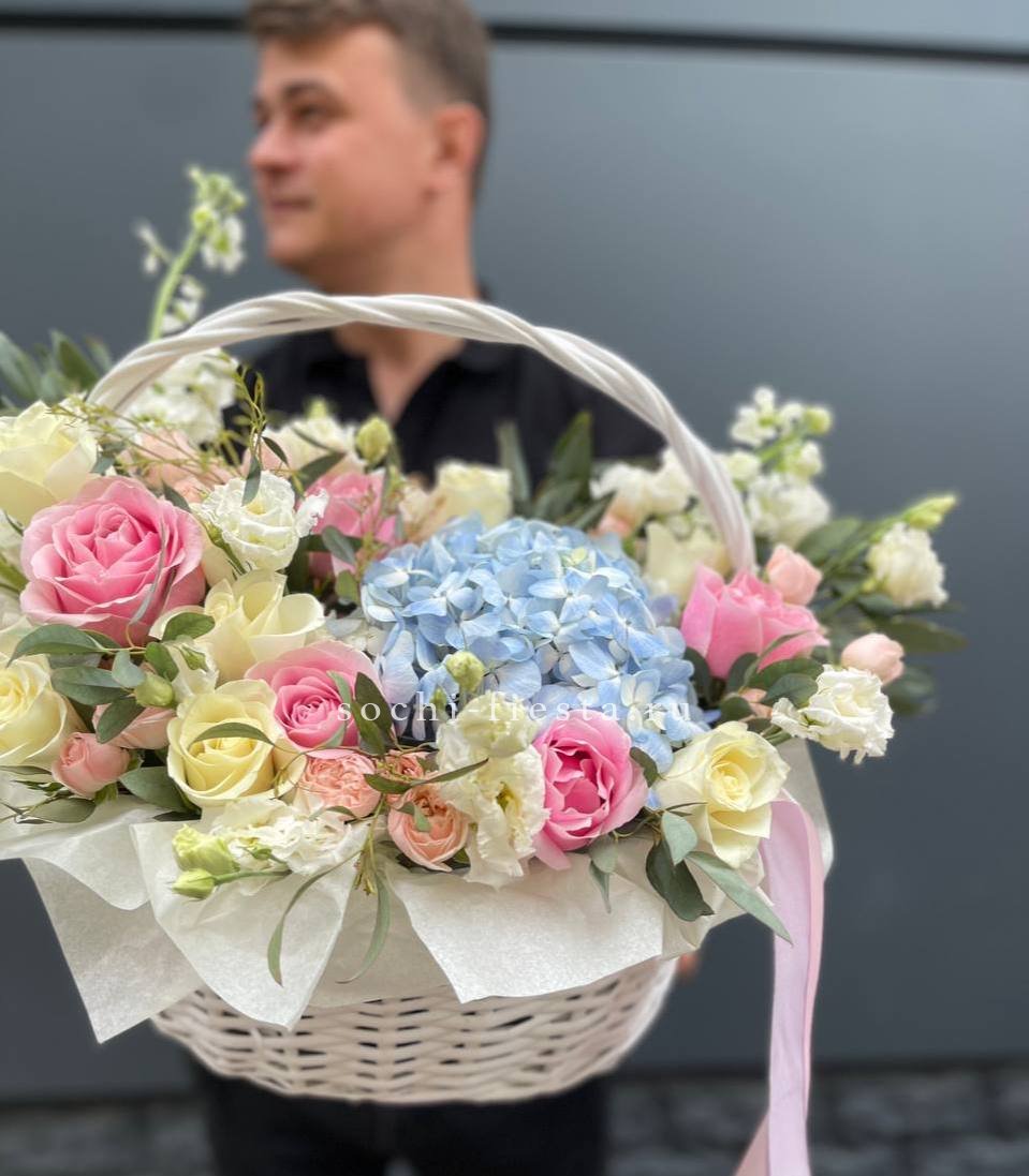 Корзина собрана плотно, каждый цветок находит своё место в общей композиции.